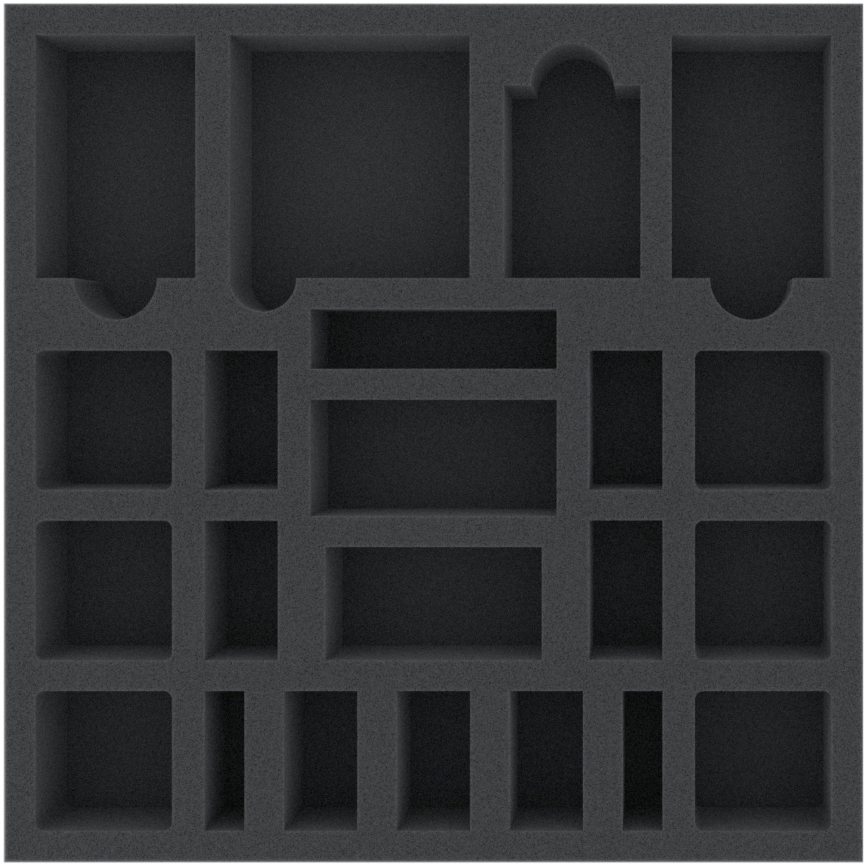 La Feldherr de 40 mm de hauteur offre 22 compartiments pour votre figurines et votre matériel de jeu. Grâce à la découpe précise, vos modèles sont bien ajustés et ne peuvent pas glisser. La mousse souple à pores fins protège les pièces délicates de la casse et les couleurs de vos modèles peints des rayures et de l'abrasion.
