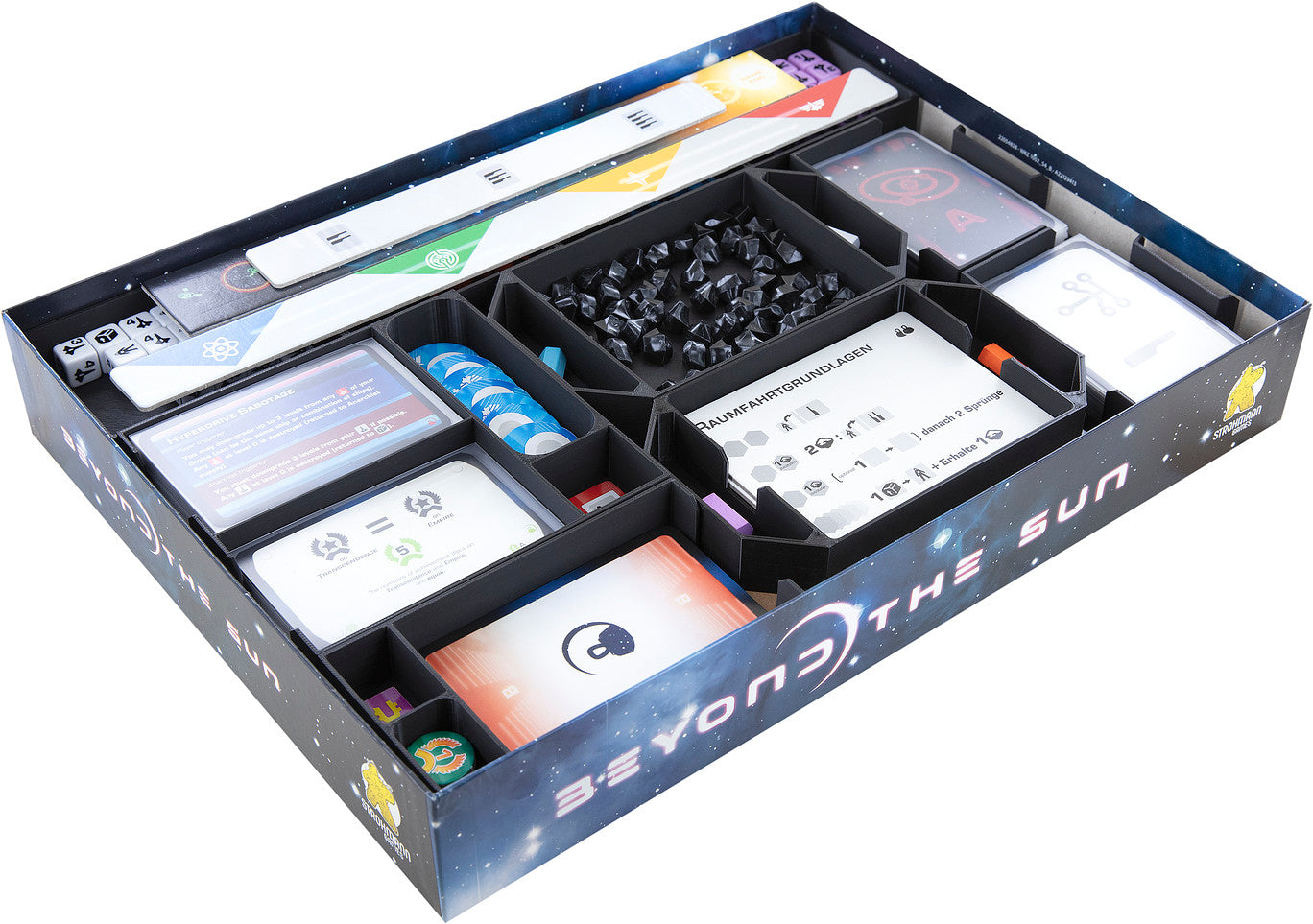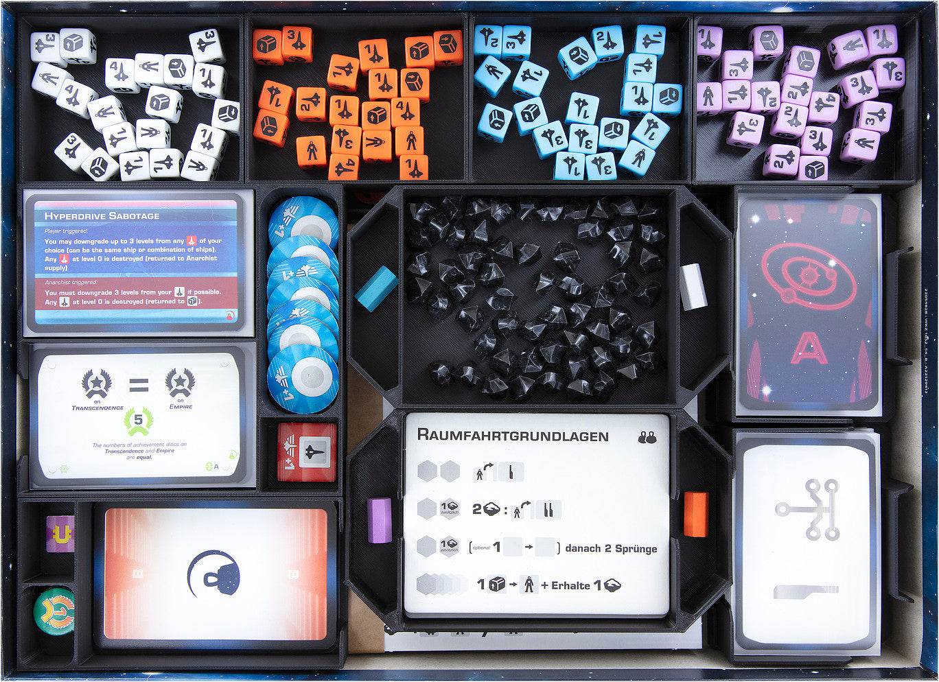 Assurez-vous une place à l'abri du soleil. Avec notre Organizer, nous prenons soin de l'ordre dans votre boîte du jeu. Le set comprend dix plateaux à jetons, 4 porte-cartes pour le jeu de base et deux plateaux pour l'extension. Avec les inserts, vous pouvez rapidement trier les composants du jeu et avoir plus de temps pour jouer. Les plateaux sont pratiques dans la boîte et sur la table. Distribuez les inserts amovibles et commencez. De cette façon, vous garderez toujours une vue d'ensemble, même dans les profondeurs de l'espace. Après le jeu, vous pouvez rapidement ranger tout dans les inserts et les remettre dans la boîte. De cette façon, vous ne rangez pas seulement rapidement, mais vous êtes également prêt pour une nouvelle partie.