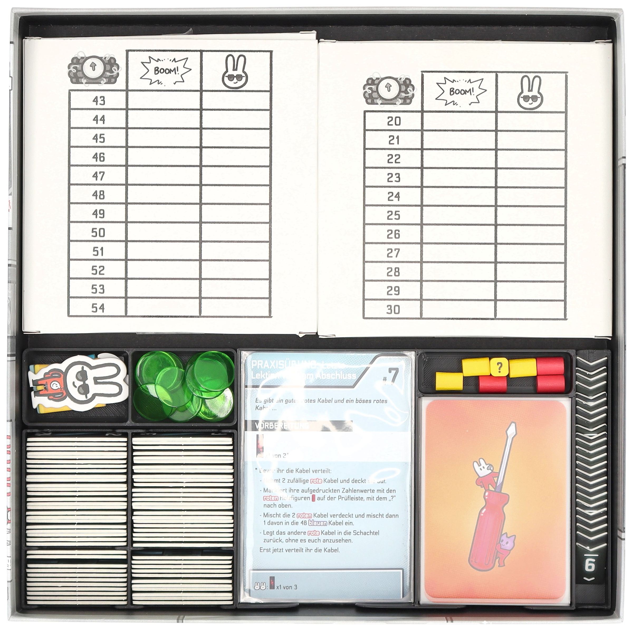 Bomb Busters apporte des puzzles, de la déduction et beaucoup d'excitation à la table de jeu. Mais ne vous inquiétez pas, nous ne vous laisserons pas seul ici non plus, et nous ne vous laisserons certainement pas exploser. Pour que le jeu se déroule sans accroc et que vous puissiez vous concentrer pleinement sur vos missions, notre Feldherr Organizer Insert ne se contente pas de ranger la boîte, il vous fournit surtout des aides de jeu astucieuses - pour une meilleure vue d'ensemble, un plus grand confort et un plus grand plaisir de jeu.