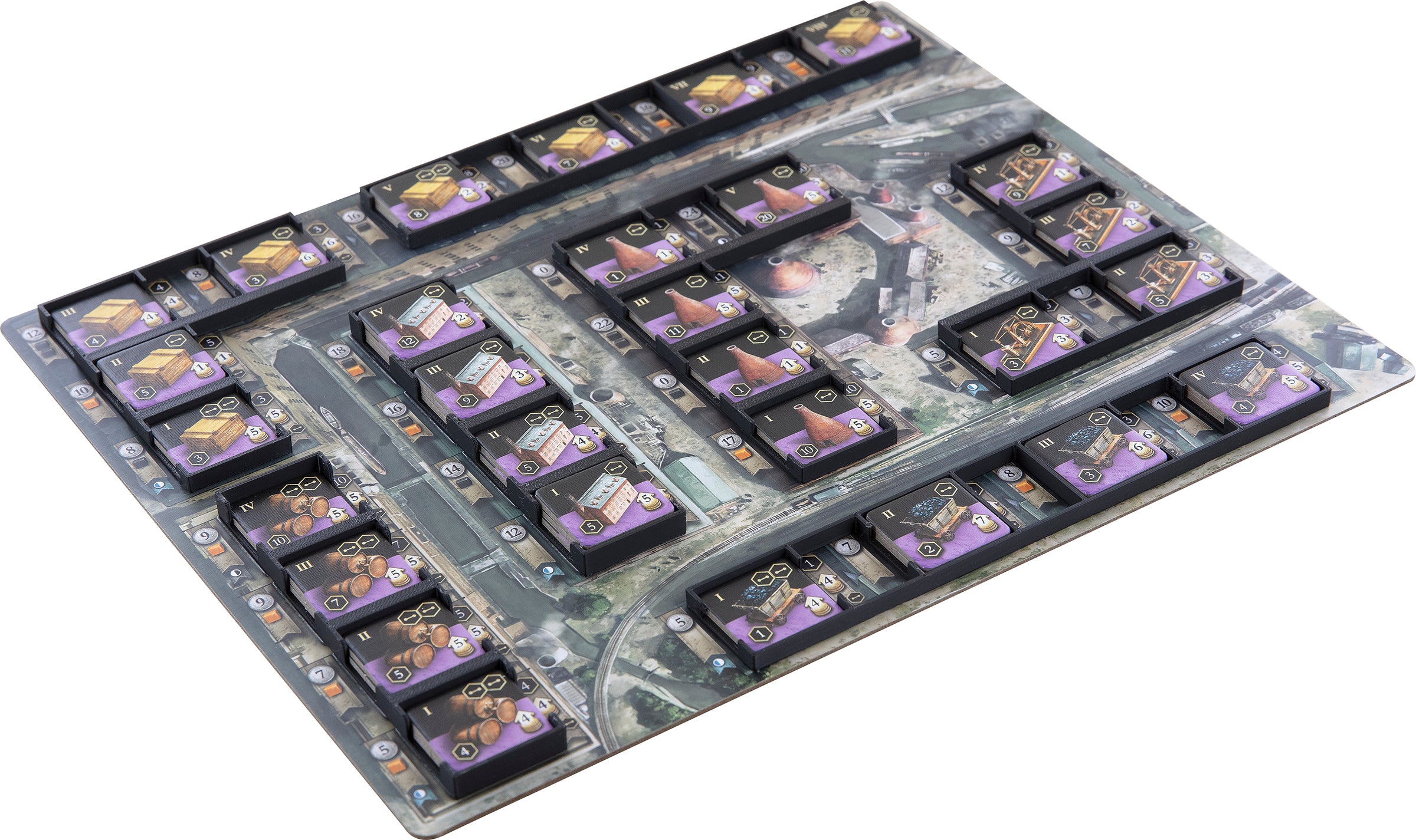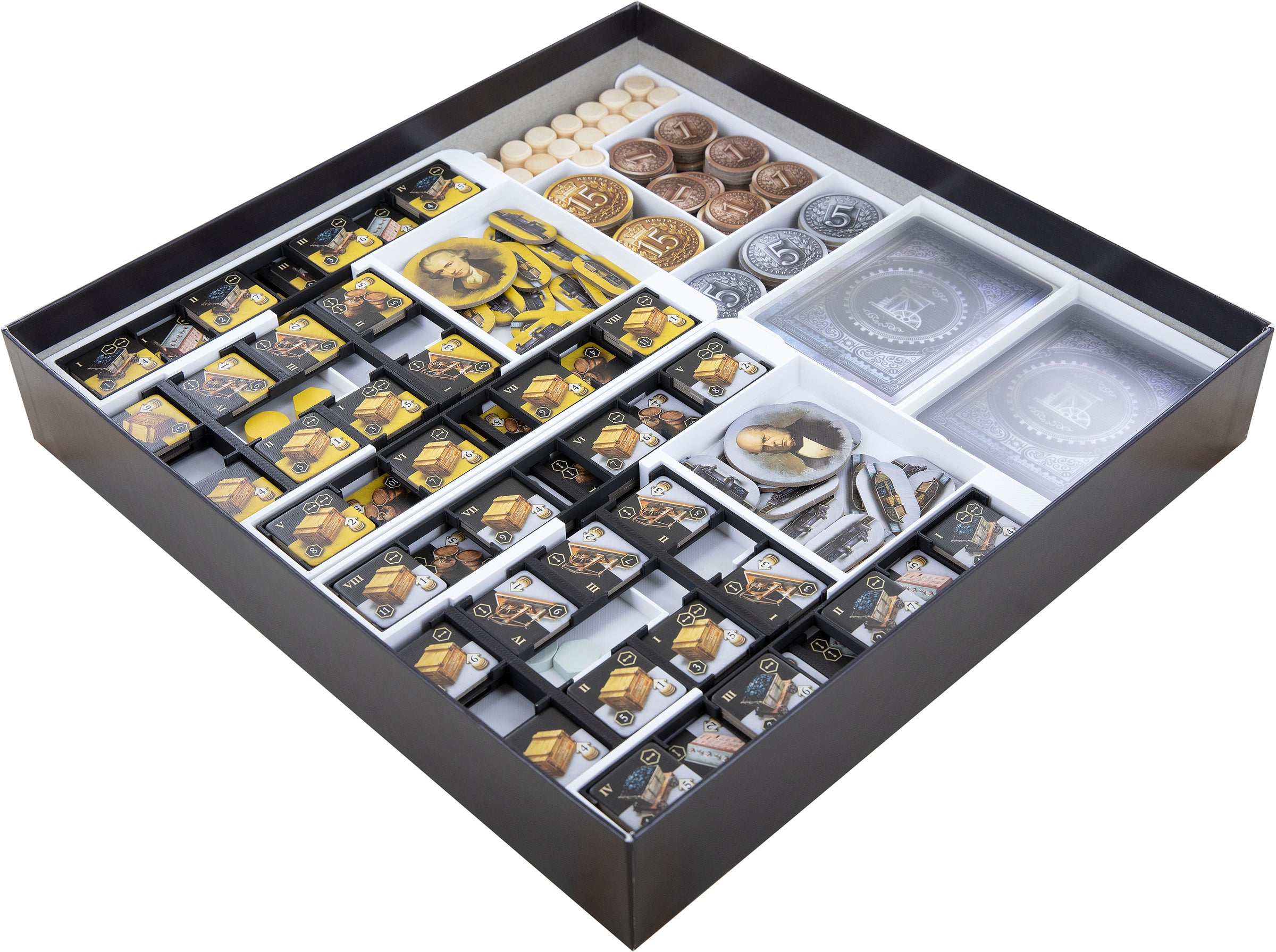 Pendant que vous vous concentrez sur l'expansion de vos usines, nous nous occupons de votre boîte du jeu. Nos inserts assurent une organisation peu encombrante et ordonnée de votre matériel de jeu dans la boîte et sur la table.