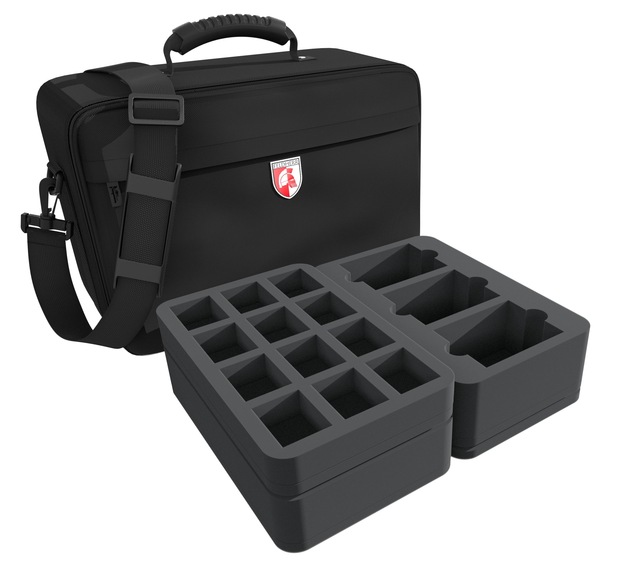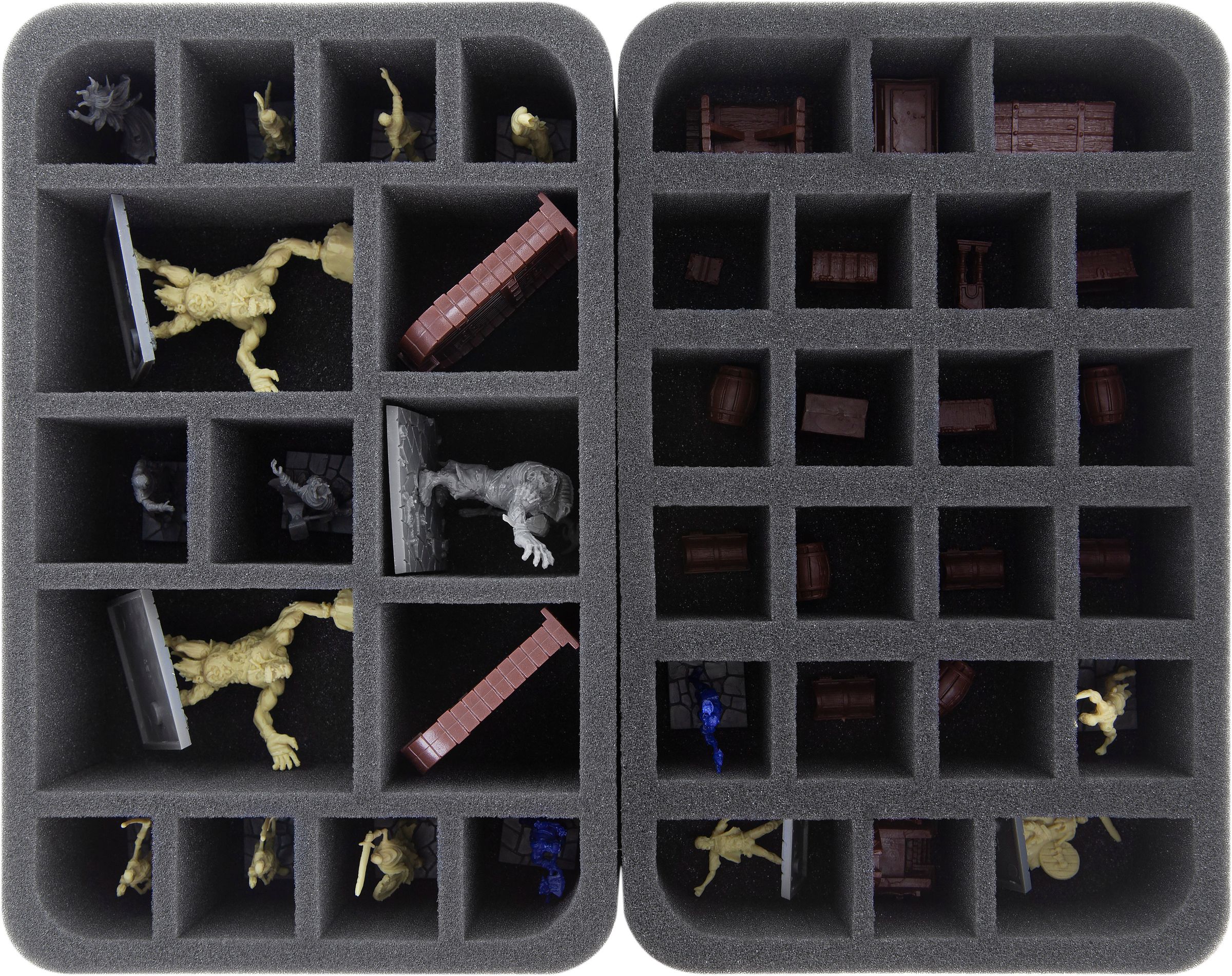 Le sac robuste est rempli de 5 plateaux en mousse assortis pour les figurines, les marqueurs, les cartes (à manches) et les dés du jeu passionnant. Vous avez ainsi trié correctement votre matériel de jeu et tout est toujours à portée de main. La mousse à pores fins offre une protection fiable - les pièces délicates comme les faux des Skeleton Warriors ne se cassent pas, les surfaces ne se rayent pas. De plus, l'ensemble contient deux sur-matelas en mousse - l'un pour mettre à niveau les piles de plateaux en mousse dans le sac, l'autre comme couvercle pour s'assurer que rien ne tombe pendant le transport.