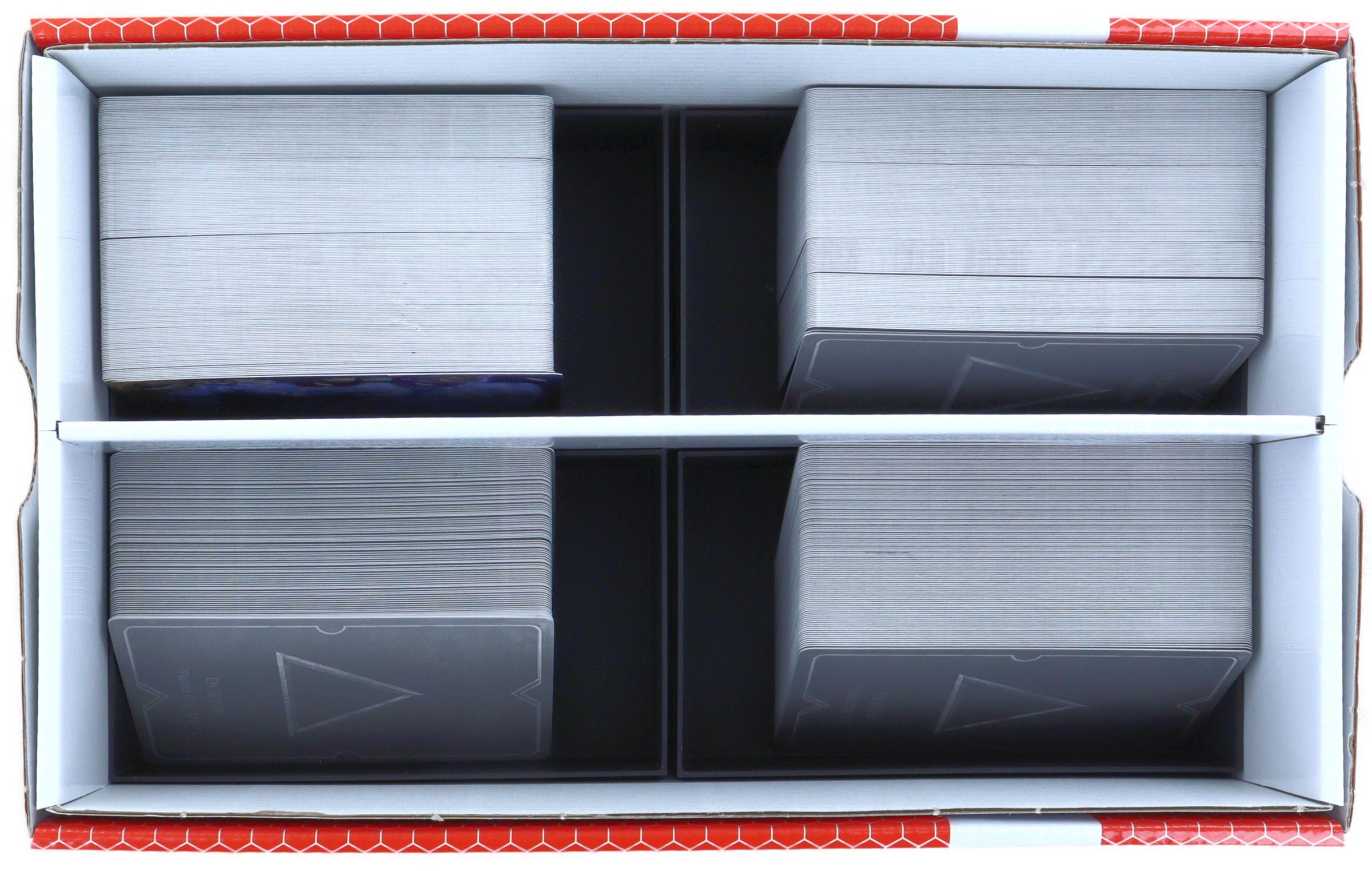 Une cloison au milieu de la boîte la divise en deux compartiments de taille égale, ce qui permet d'aligner les cartes sans qu'elles ne se mélangent pendant le transport.