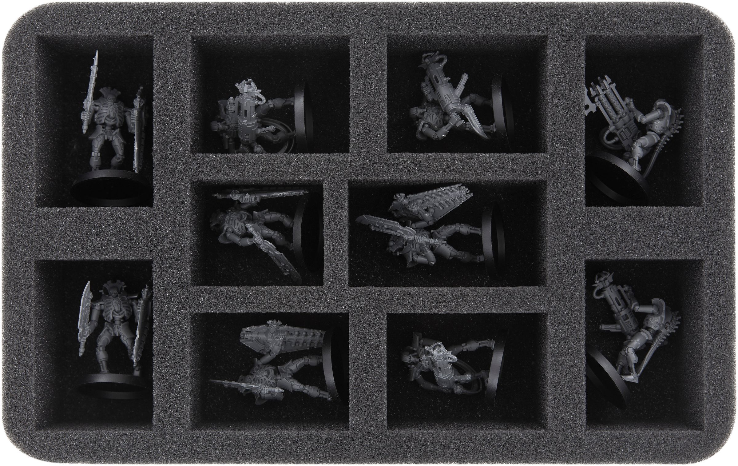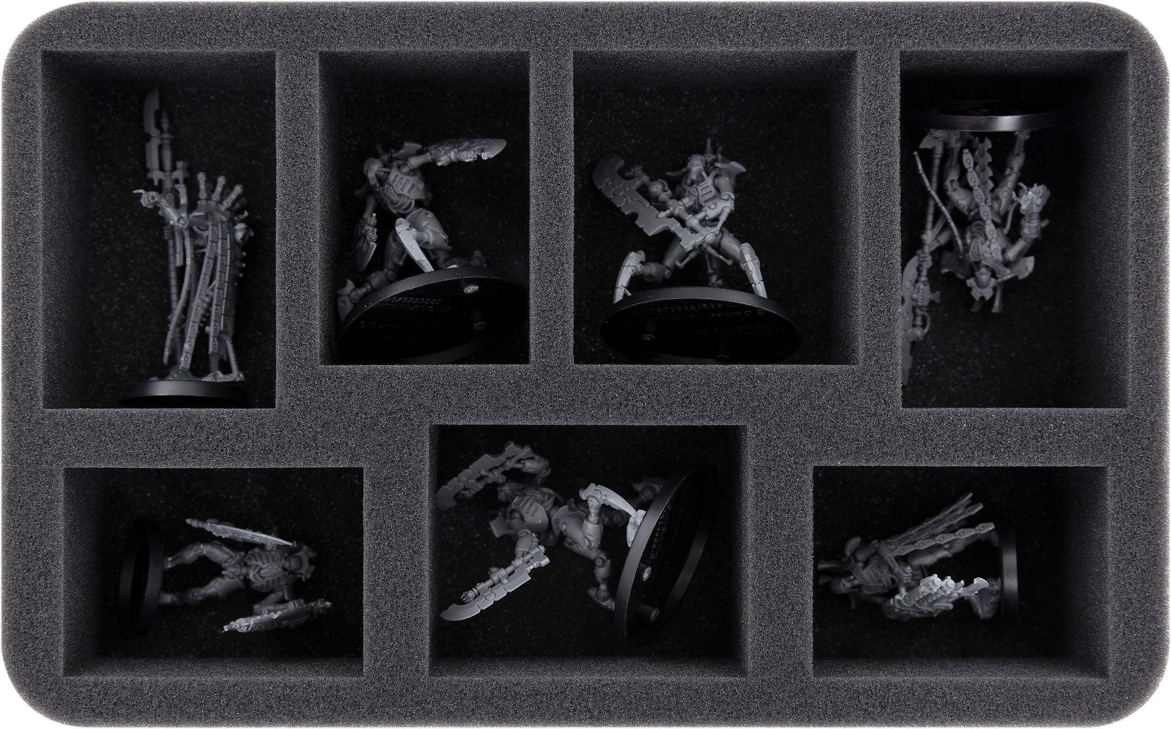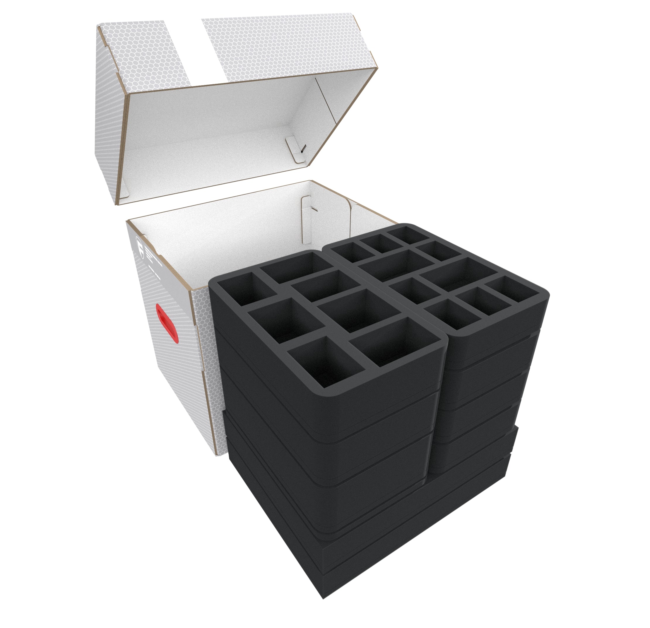 Grâce au savoir-faire éprouvé de Feldherr, vous pouvez disposer toutes les figurines de la boîte Indomitus et les transporter en toute sécurité. Le set contient un total de 8 plateaux en mousse. Que ce soit Outrider on Bike ou Skorpekh Lord, chacun des 61 Les chiffres ont leur compartiment. Il offre un espace supplémentaire pour plus de 35 figurines supplémentaires, ce qui évite que vos figurines ne glissent et ne s'abîment. Grâce à la mousse souple et à pores fins, les couleurs de vos modèles peints sont épargnées de l'abrasion et des rayures.