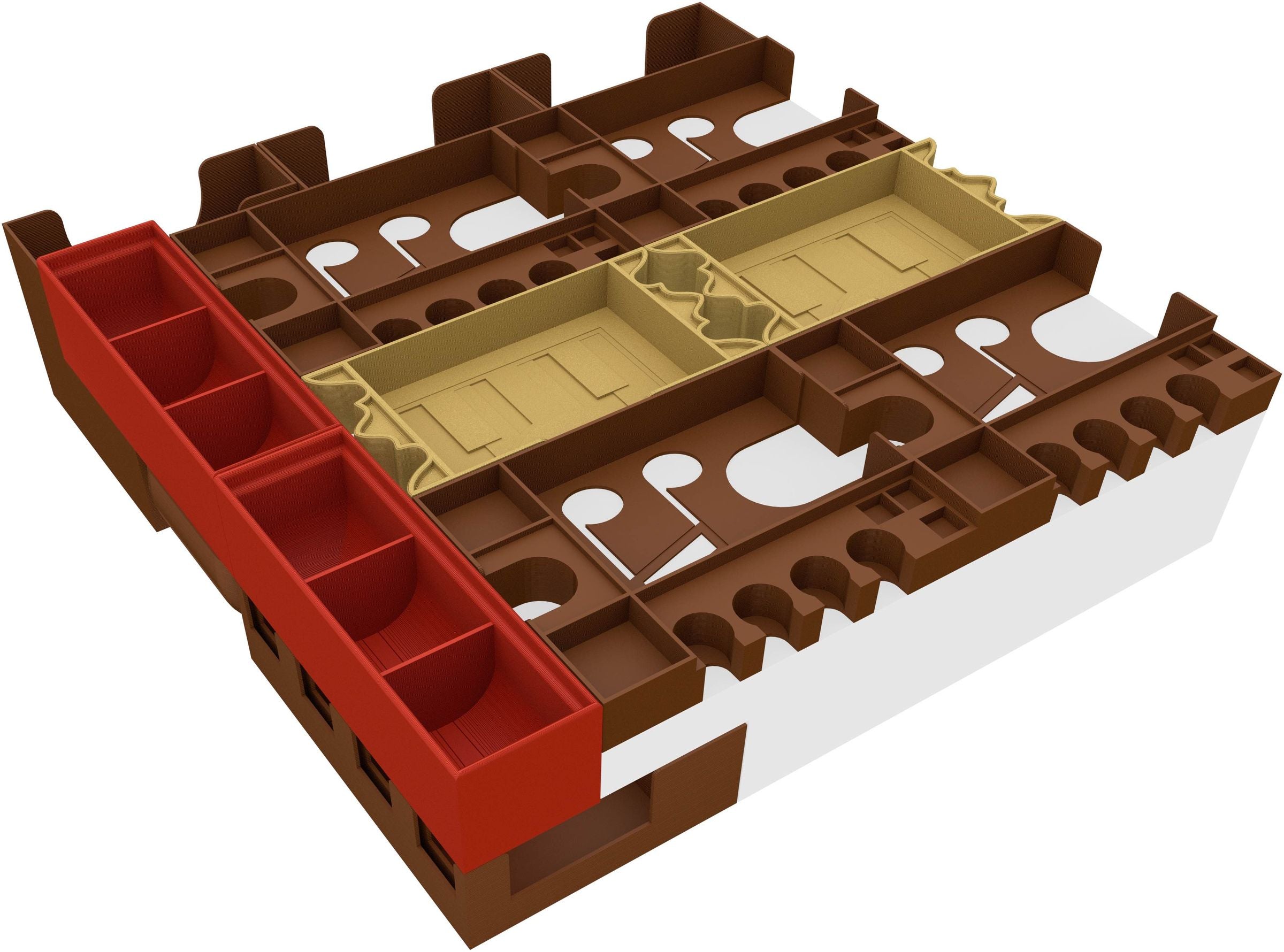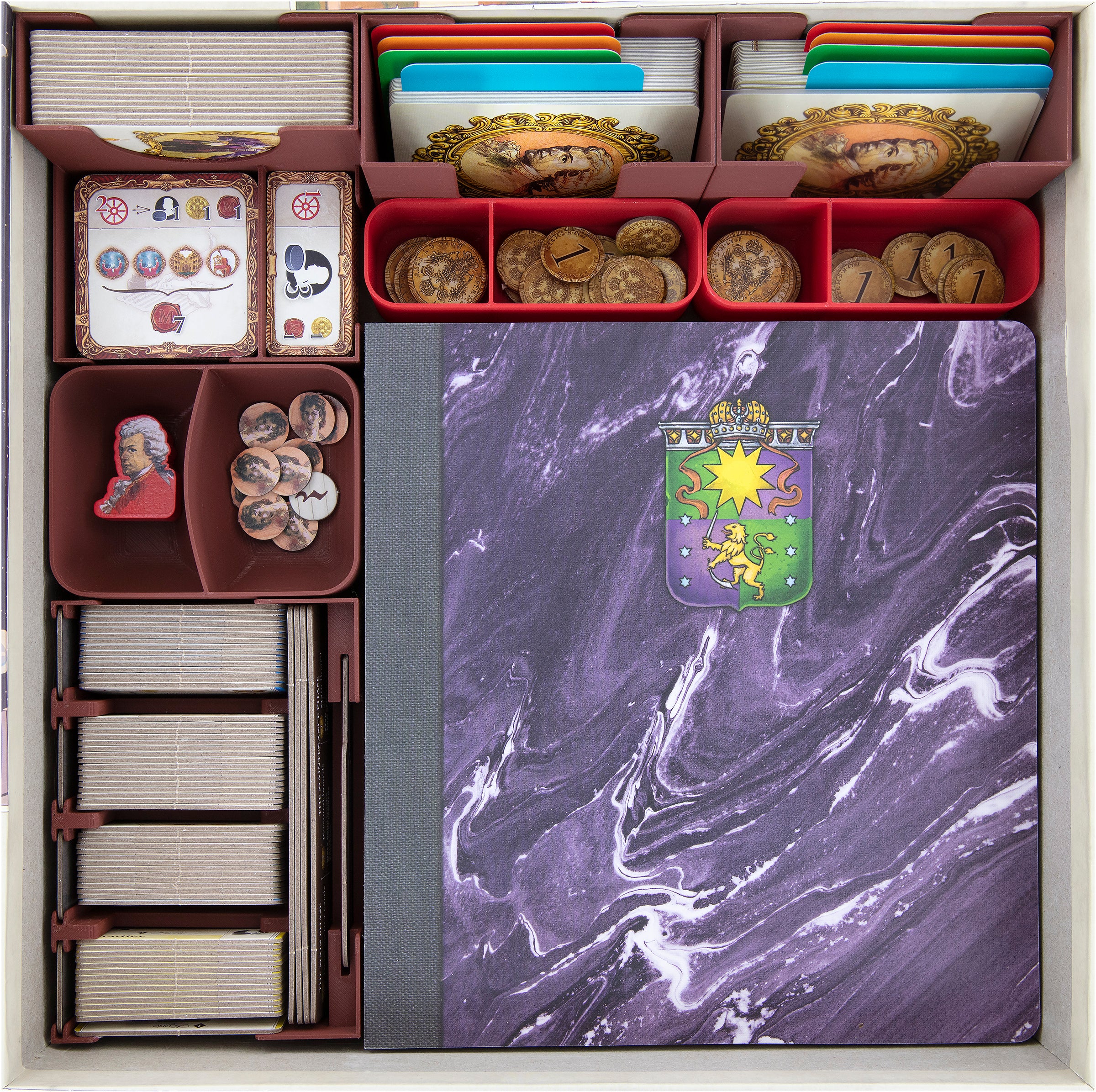Les inserts amovibles individuellement permettent non seulement de contrôler le contenu de votre boîte du jeu, mais aussi d'assurer l'ordre sur le plateau de table. Les plateaux de ressources et les porte-monnaies sont deux fois présents dans le set, de sorte que les joueurs n'ont pas à s'étirer trop loin pour trouver du matériel de jeu.