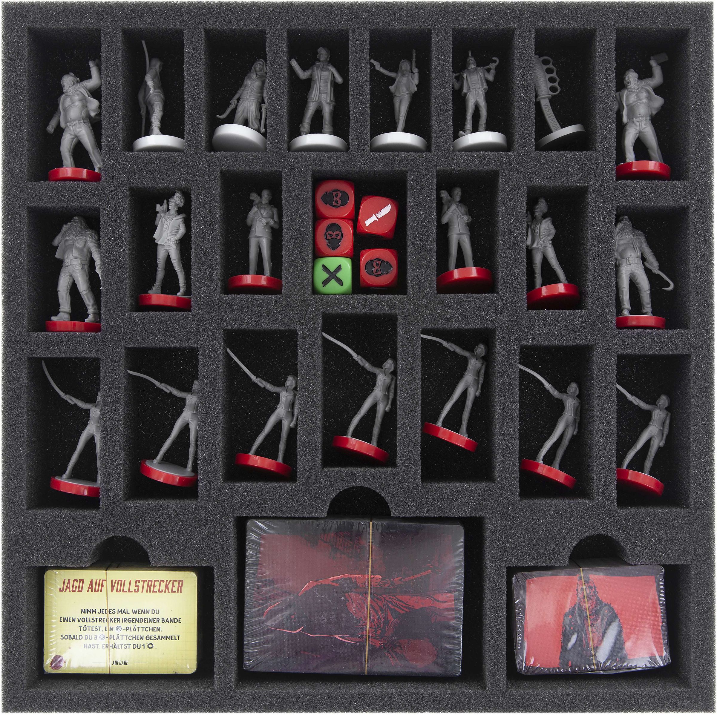 Ce plateau en mousse avec 25 compartiments est taillé sur mesure pour le jeu de société Vengeance by Mighty Boards. 21 compartiments peuvent contenir des figurines, 3 compartiments sont réservés aux cartes, 1 compartiment peut contenir des accessoires comme par exemple des dés.