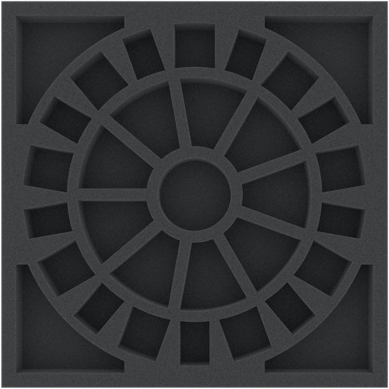 Le plateau en mousse a les dimensions suivantes : 265 mm x 265 mm x 30 mm hauteur totale (20 mm hauteur utile + 10 mm base en mousse).