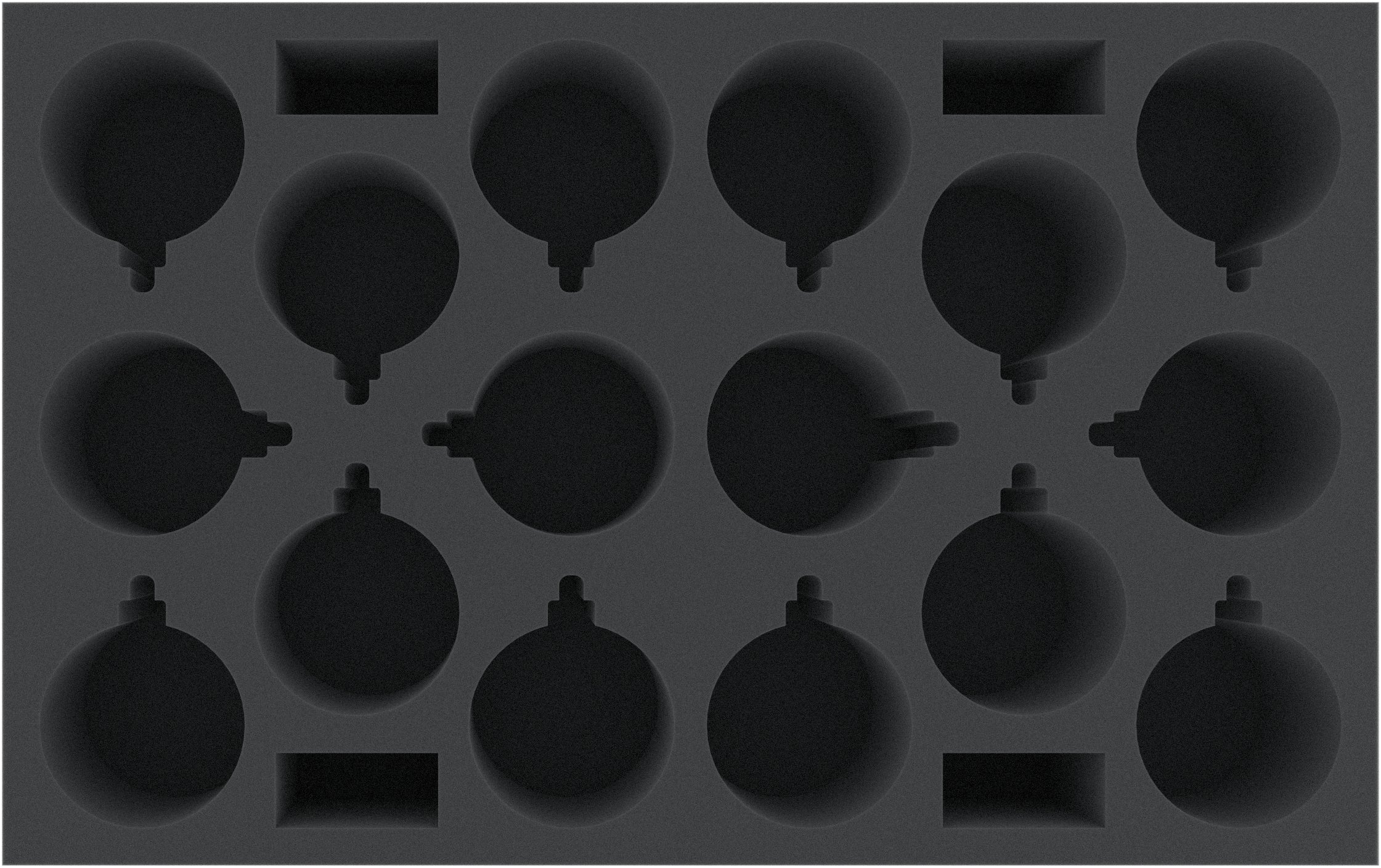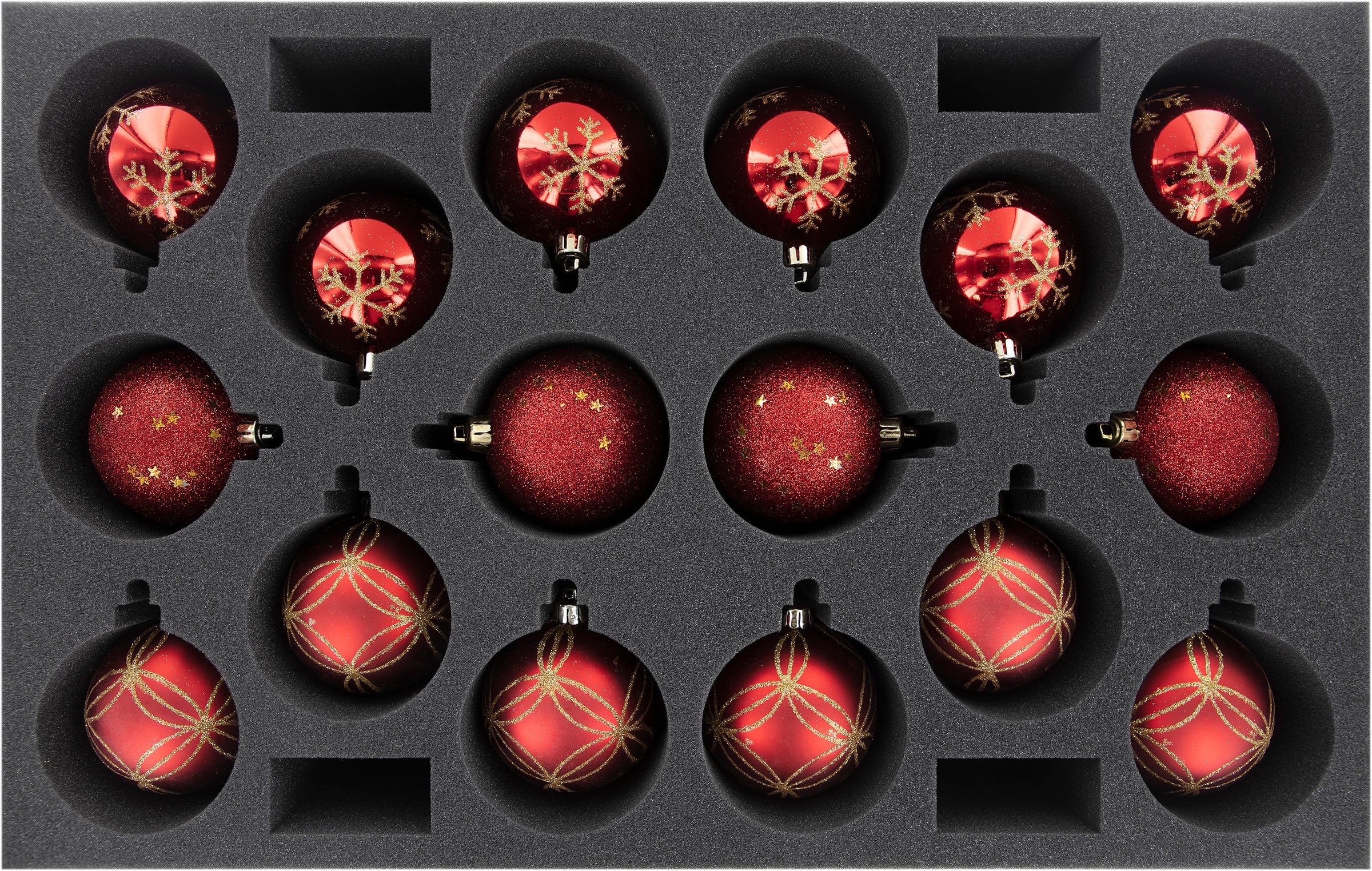 Le même problème de boules de Noël que chaque année ? En utilisant les plateaux en mousse Feldherr, les boules décoratives sensibles survivent au stockage et au transport sans être endommagées. 16 boules d'un diamètre de 80 mm trouvent chacune leur place dans la mousse souple. Même en cas de chute d'une grande hauteur, elles survivront sans problème. La prudence est donc toujours de mise lorsqu'il s'agit de les suspendre et de les retirer.