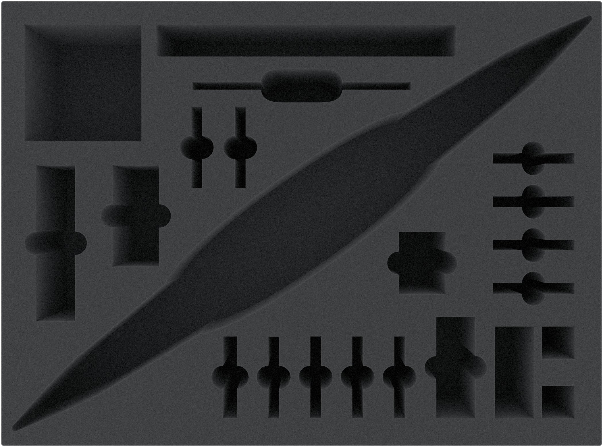 - Le plateau en mousse a les dimensions suivantes : 770 mm x 570 mm x 130 mm de hauteur totale (120 mm de hauteur utile + 10 mm de mousse de fond)