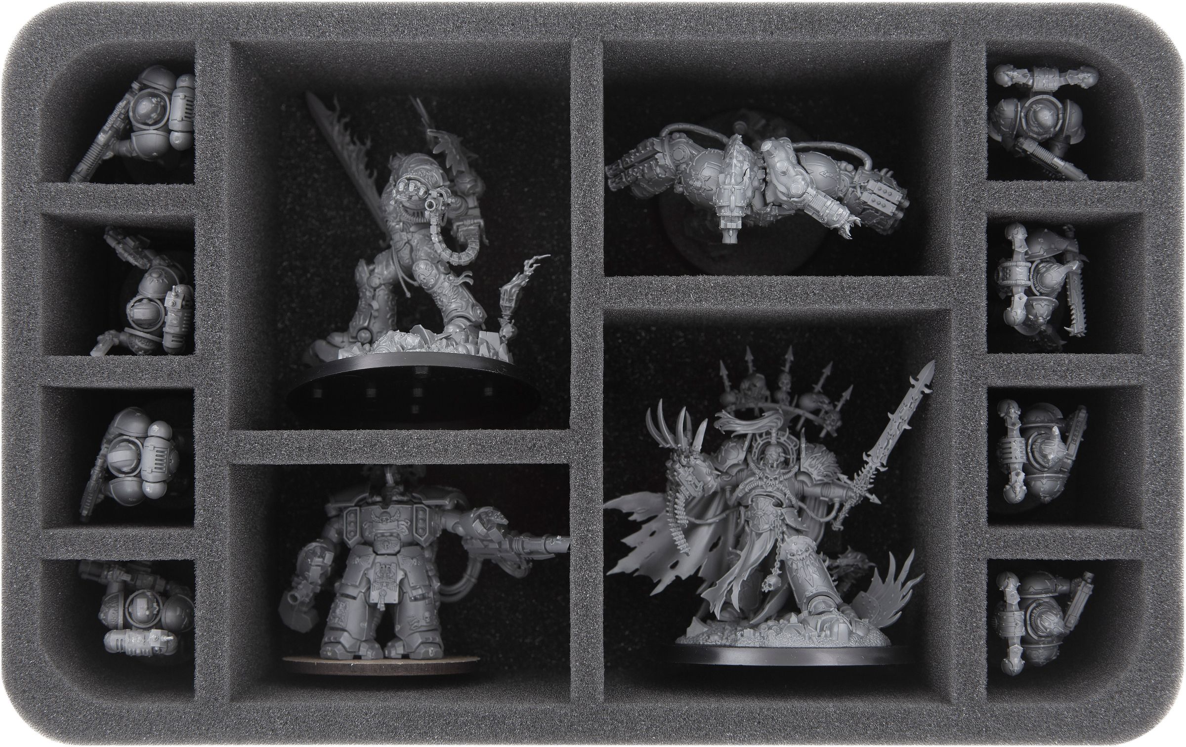 Les grands compartiments des deux plateaux HSMEME110BO peuvent contenir chacun un Venomcrawler. De plus, les plateaux offrent de la place pour quatre modèles plus grands chacun, par exemple Obliterators, Greater Possessed ou Master of Possession. Les deux plus petits compartiments de chacun des deux plateaux conviennent pour les Space Marines du Chaos standard sur des bases de 32 mm.
