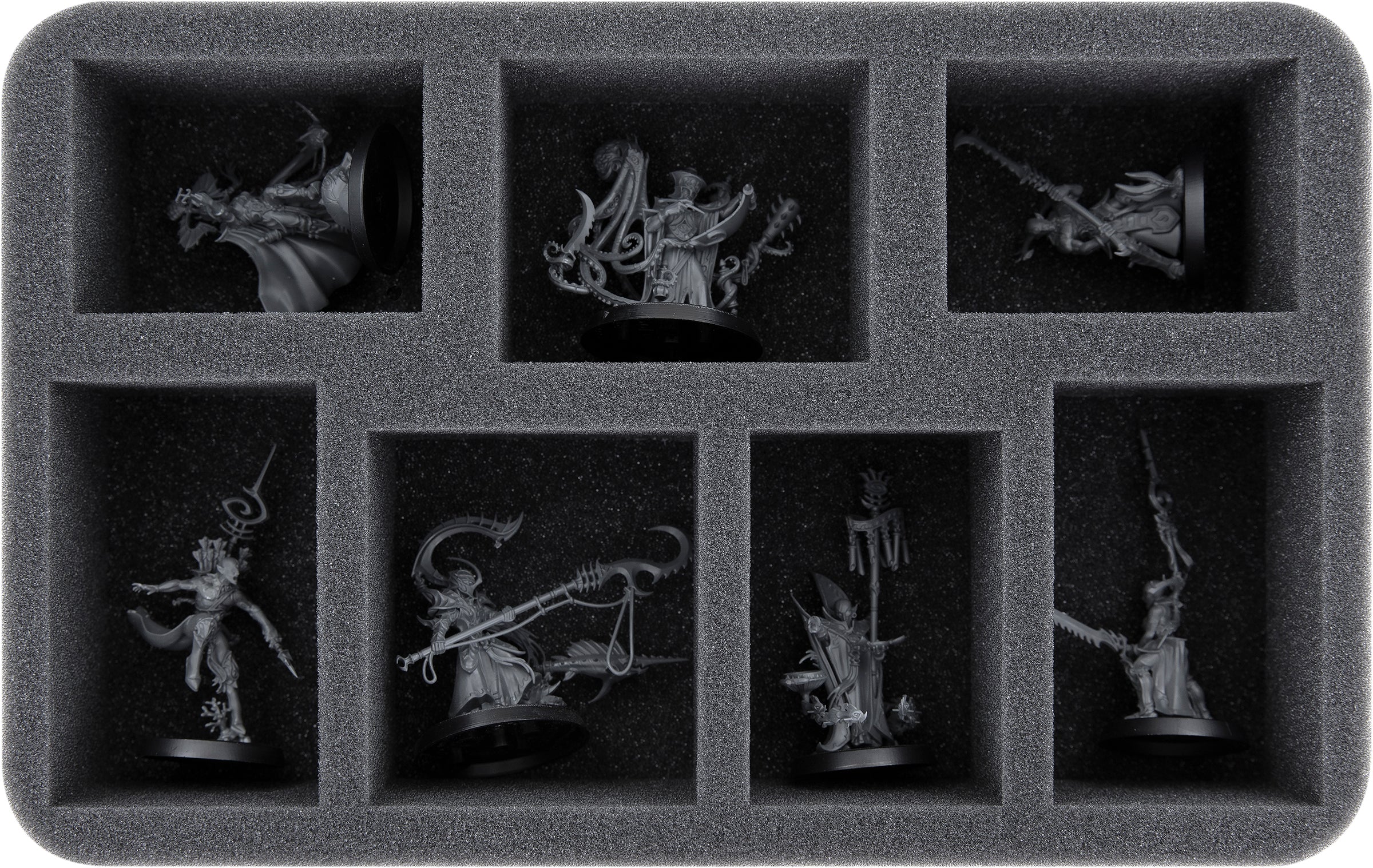 Vous pouvez stocker et transporter en toute sécurité jusqu'à sept modèles de guerriers d'Idoneth Deepkin dans le plateau Half-Size à sept compartiments. Les Thralls Namarti, les Reavers Namarti et les modèles de dimensions similaires y trouveront une place de repos.