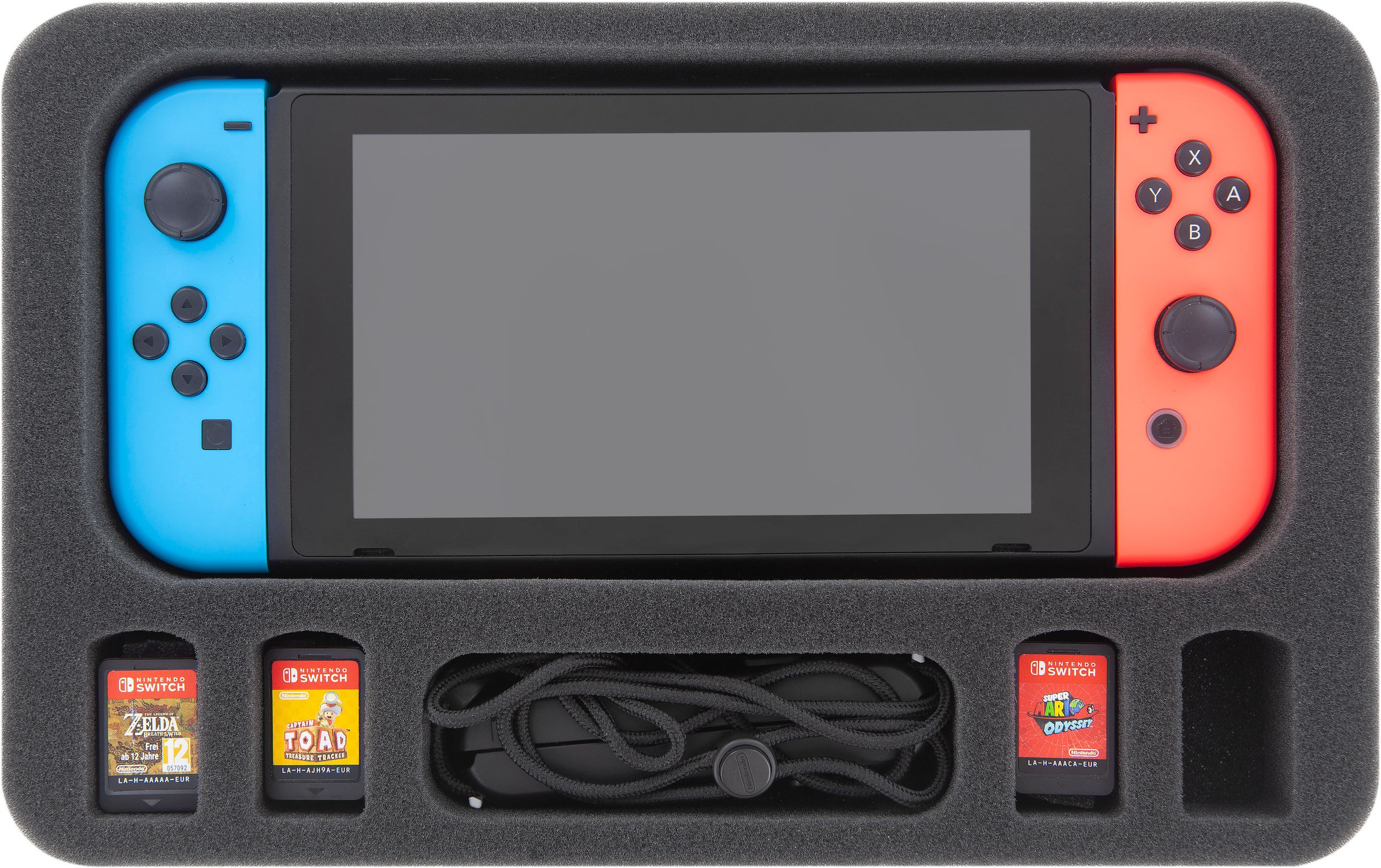 Le plateau en mousse comporte six compartiments. Le grand compartiment est taillé sur mesure pour la console assemblée (écran tactile + deux Joy-Cons). Doucement niché dans de la mousse à pores fins, l'appareil est protégé de manière optimale contre les rayures et les chocs.