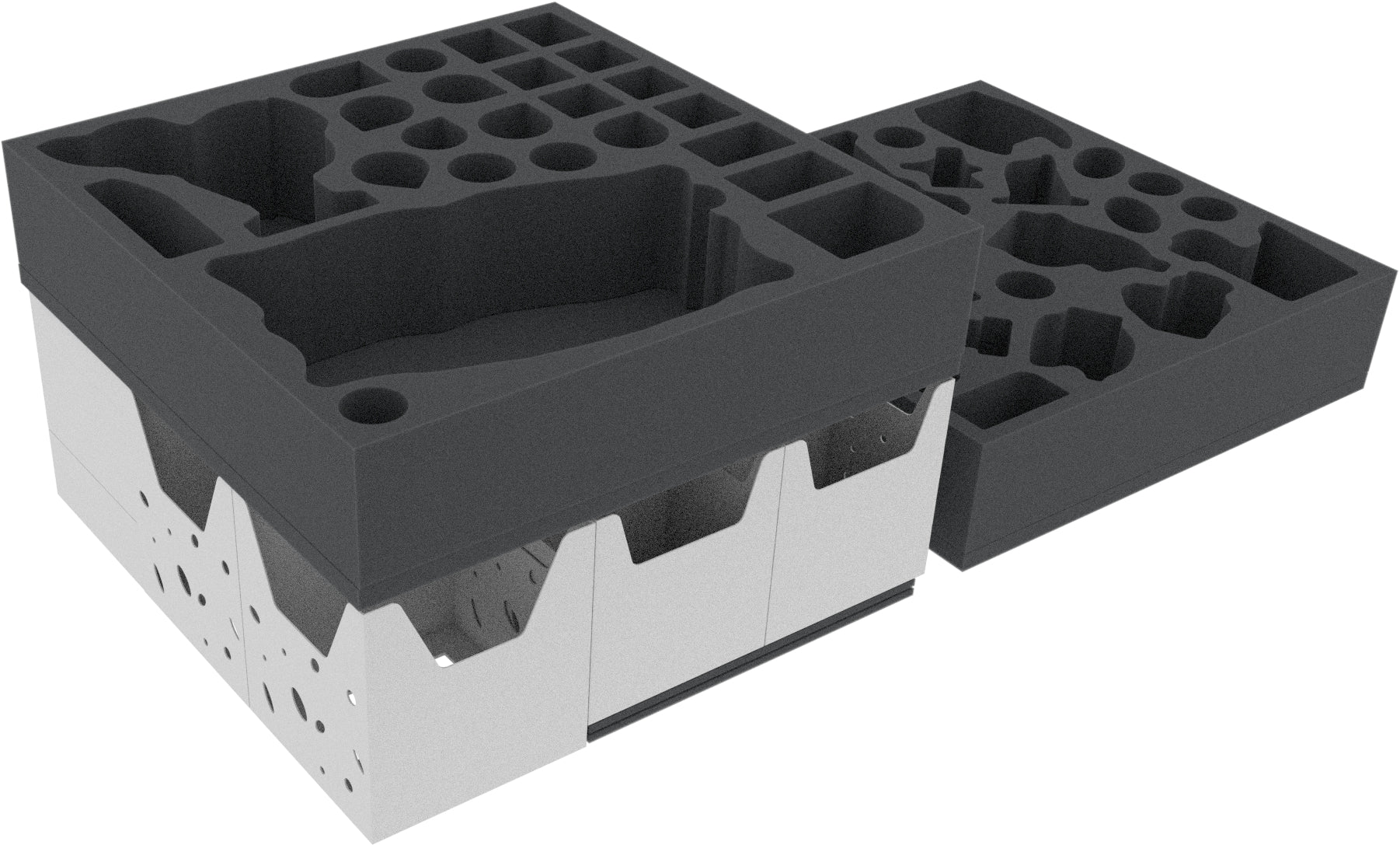 Un tapis de mousse épais améliore la stabilité et empêche les porte-cartes de glisser. Trois tapis de mousse fins sont utilisés comme compensation de hauteur à l'intérieur de la boîte de jeu centrale . Placez les toppers en mousse sur les plateaux en mousse. Ils garantissent qu'aucun de vos précieux modèles ne se heurtera aux couvercles des boîtes de jeu de société pendant le transport.