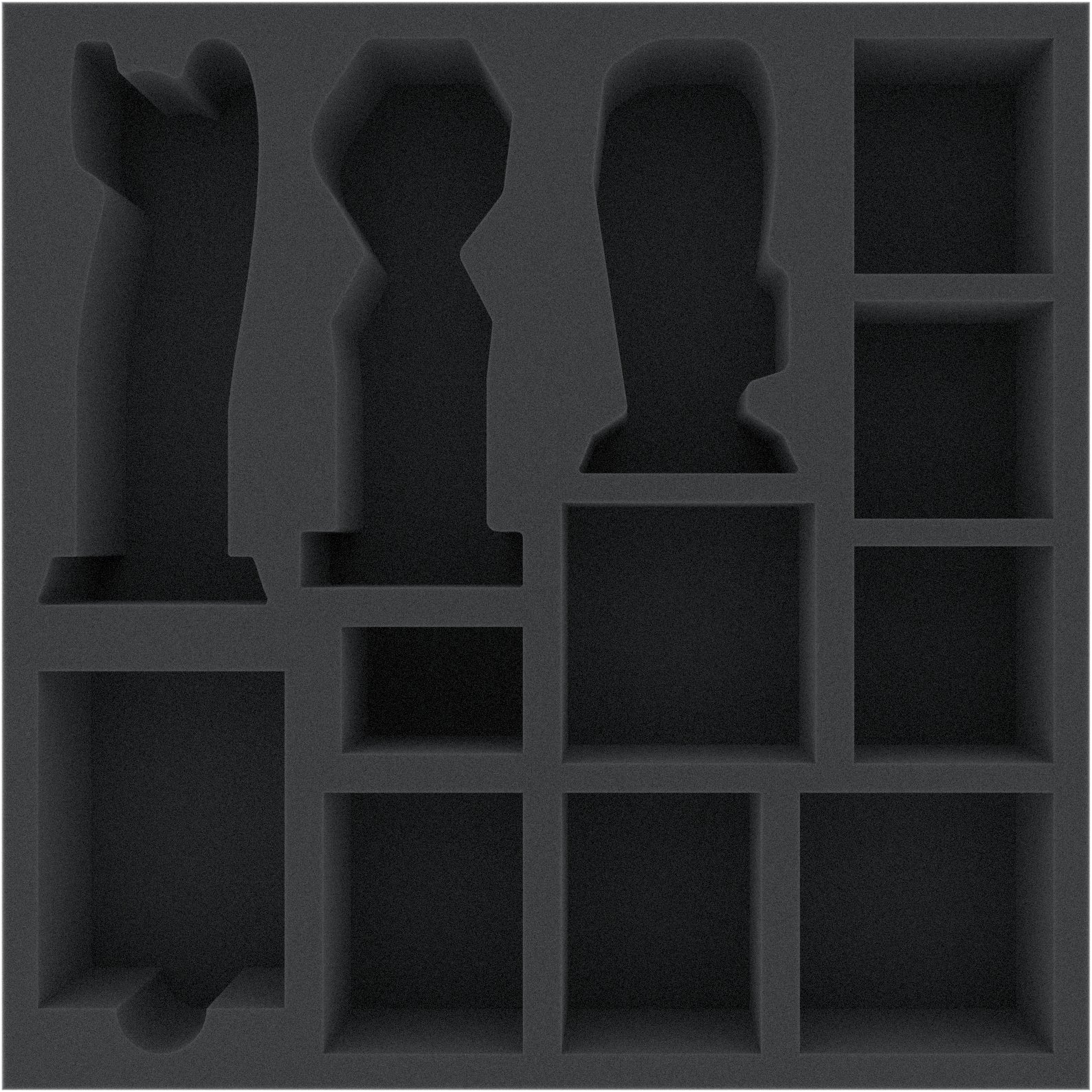 Chaque figurine reçoit un compartiment découpé sur mesure, et les trois statues ont même un compartiments découpé sur mesure. La découpe personnalisée facilite le tri et permet de s'assurer que rien ne glisse en cours de route. Une fois que vous avez peint vos modèles, vous pouvez être sûr que les peintures seront encore intactes après le transport.