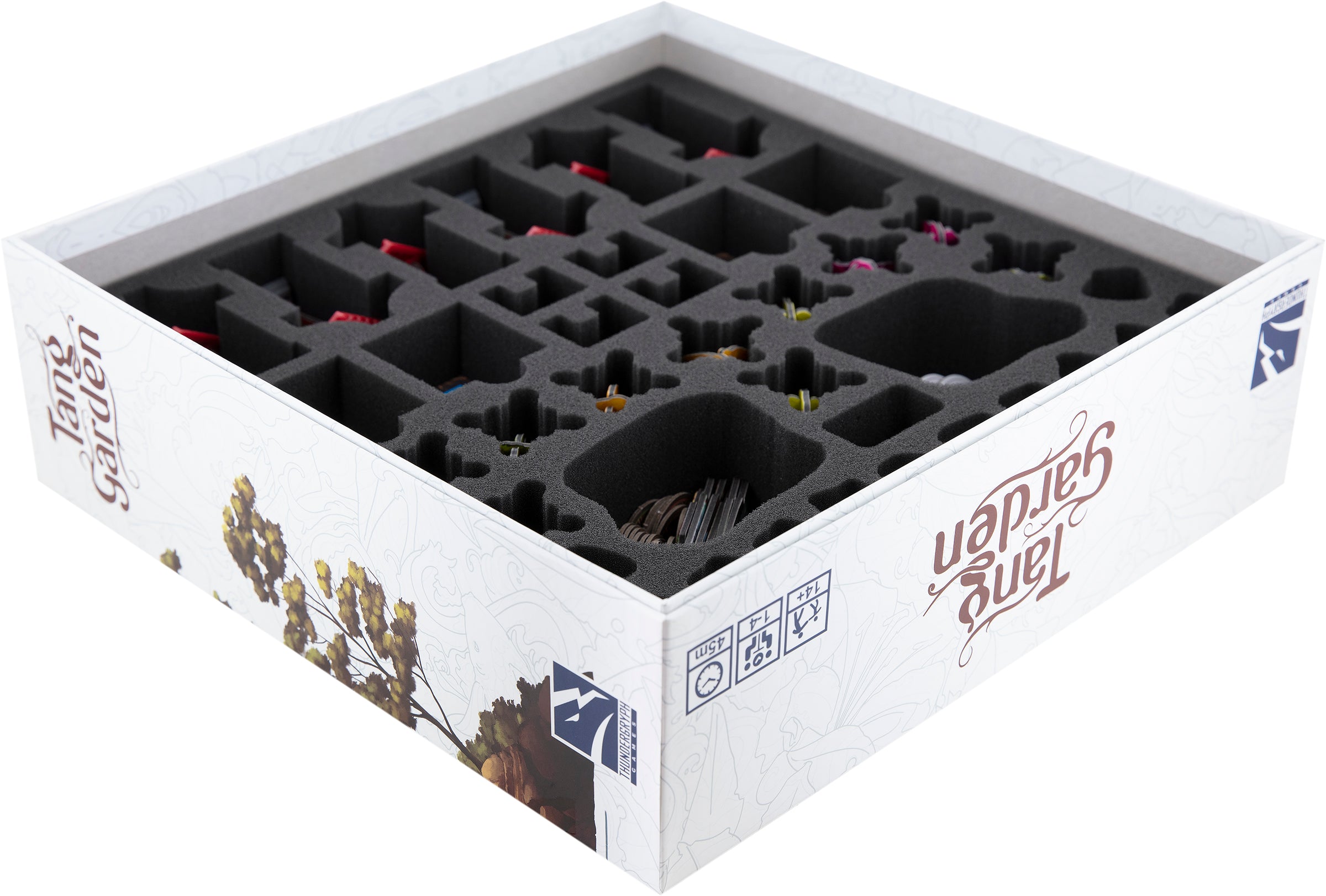 Une fois que tout est en place, couvrez le plateau avec le surmoulage en mousse fourni. Vous pouvez y placer le porte jeton et le porte carte, les grandes tuiles de paysage, les tableaux des joueurs, la tuile de départ, le tableau de jardin et le livre de règles.