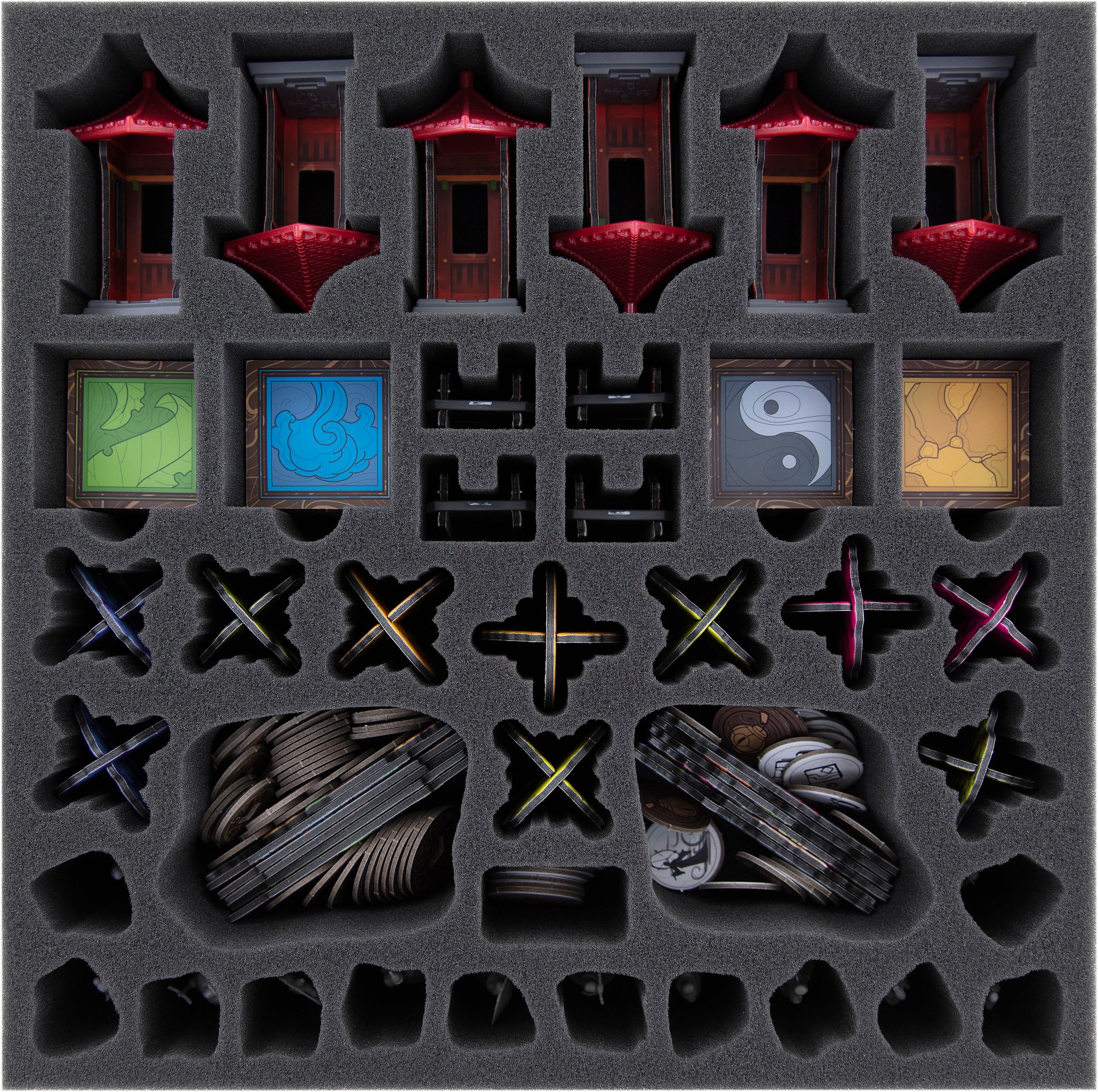Il ne peut rien sortir de bon d'une boîte mal rangée. Et encore moins de deux boîtes en désordre. C'est pourquoi nous avons le paquet de mousse Feldherr correspondant pour le rangement ordonné et sûr de tous les éléments de jeu de la campagne "Tang Garden" Kickstarter.