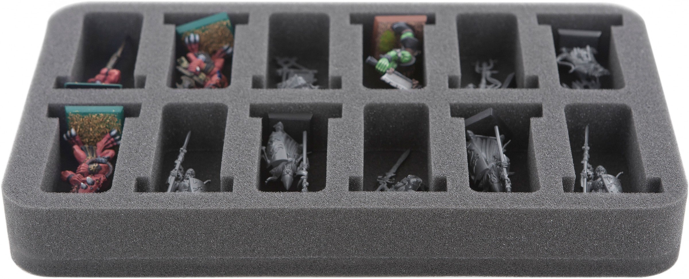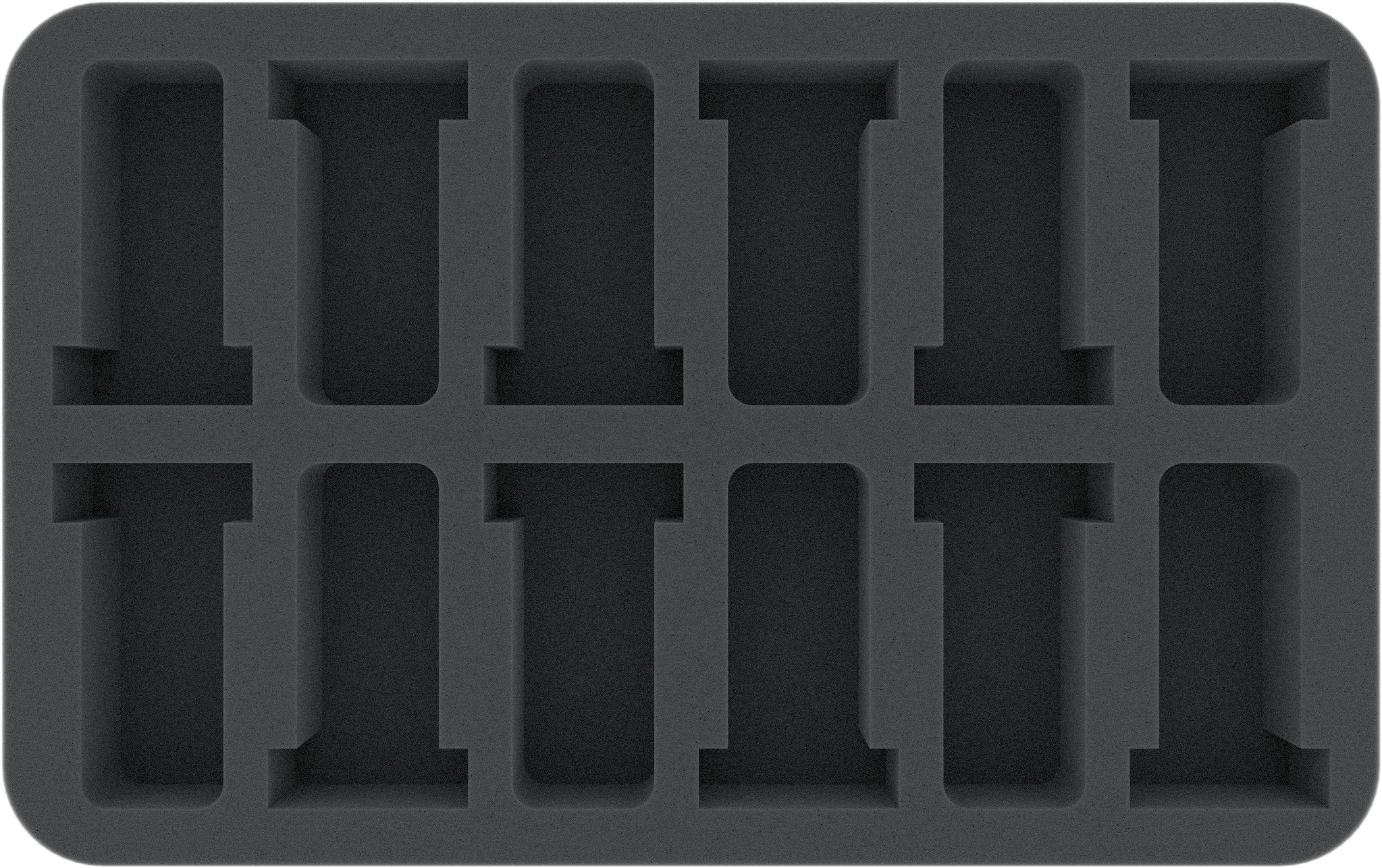 Plateau en mousse pour petites figurines sur socle 25 mm. La profondeur de 35 mm de la mousse est obtenue à partir d'une base en mousse de 10 mm et d'un plateau en mousse à fentes avec 25 mm de profondeur utile. Le plateau en mousse demi-taille se range dans nos sacs Feldherr, étuis rigides, sacs à dos et boîtes de rangement.