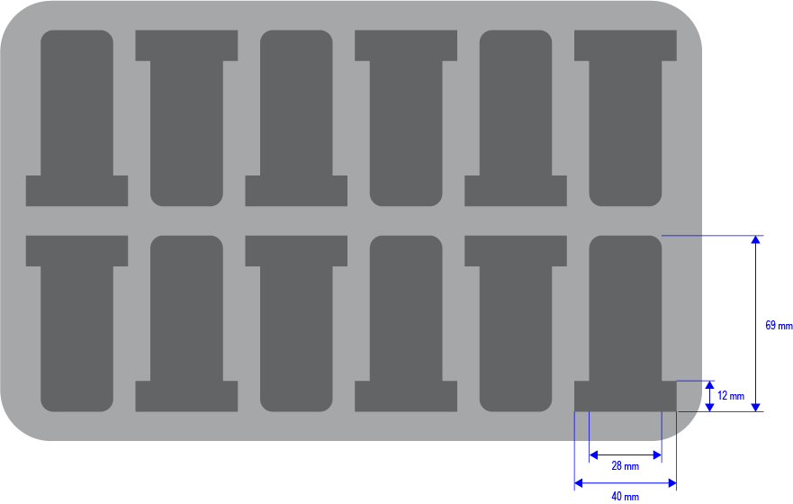 • 12 emplacements : 40/28 mm x 69 mm x 25 mm