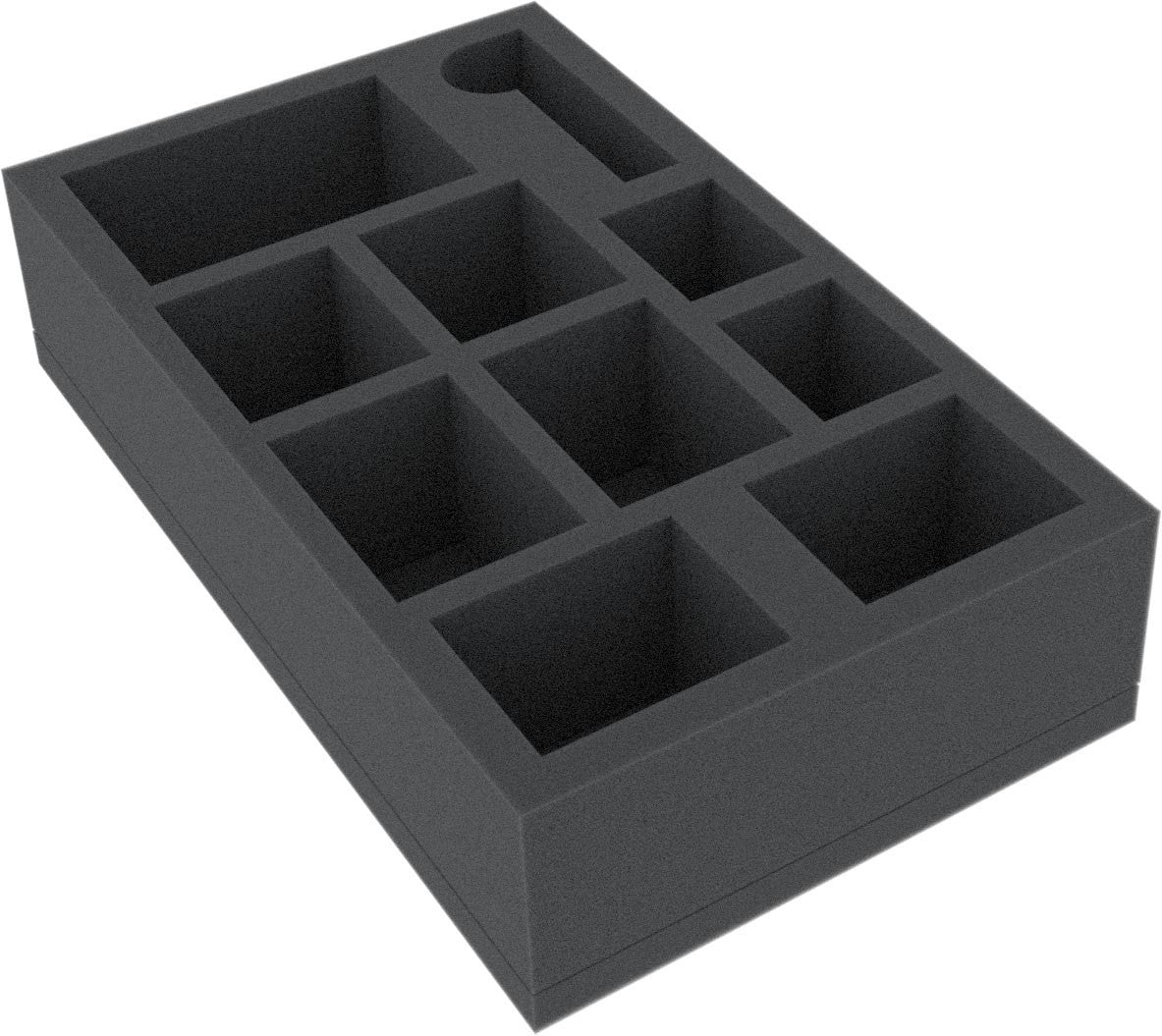 Insert en mousse pour la petite boîte Sin. L'insert mesure 238 mm x 140 mm x 55 mm et est livré avec un sur-matelas assorti. Il y a assez d'espace pour 6 Abominations, 1 Avatar et 1 Comtroller, ainsi que les cartes (avec ou sans manches) et accessoires.