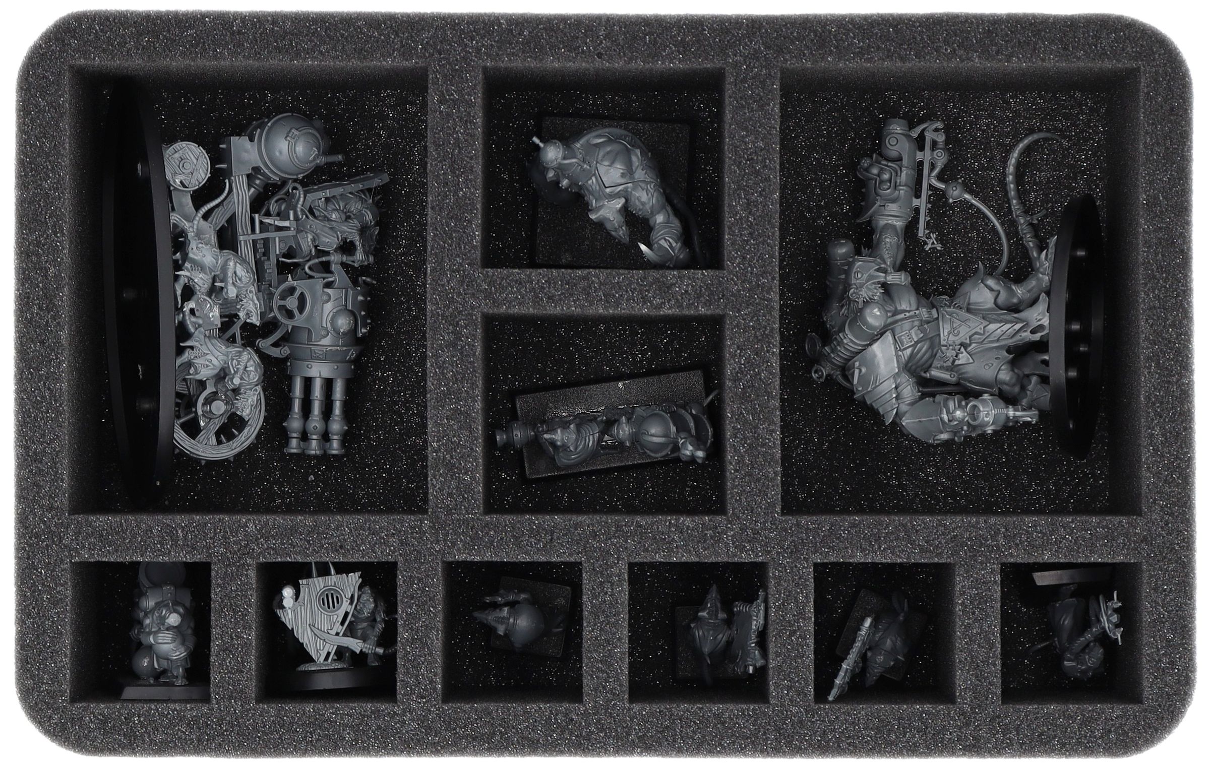 - 1 plateau en mousse de taille moyenne avec 10 compartiments pour des figurines comme les Rat Ogors, Ratling Warpblaster et des modèles de taille similaire (HS080A031)