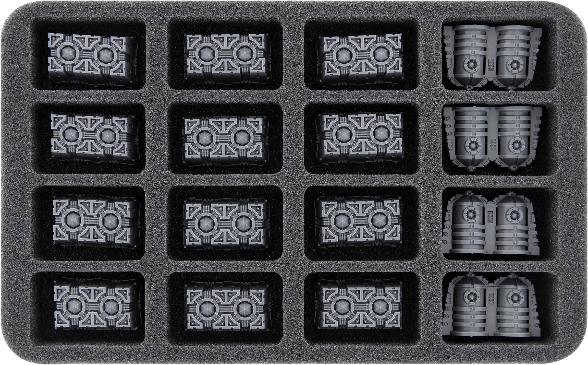 Répartis sur un plateau en mousse Full-Size et cinq plateaux Half-Size, les figurines, les pièces de terrain et les cartes d'objectifs de mission du jeu sont rangés en toute sécurité. Des compartiments adaptés à chaque modèle permettent d'éviter que les figurines ne glissent ou ne se heurtent les unes aux autres pendant le transport. Cela permet également de préserver les peintures des Space Marines ou des Nécrons peints de l'abrasion et des rayures.