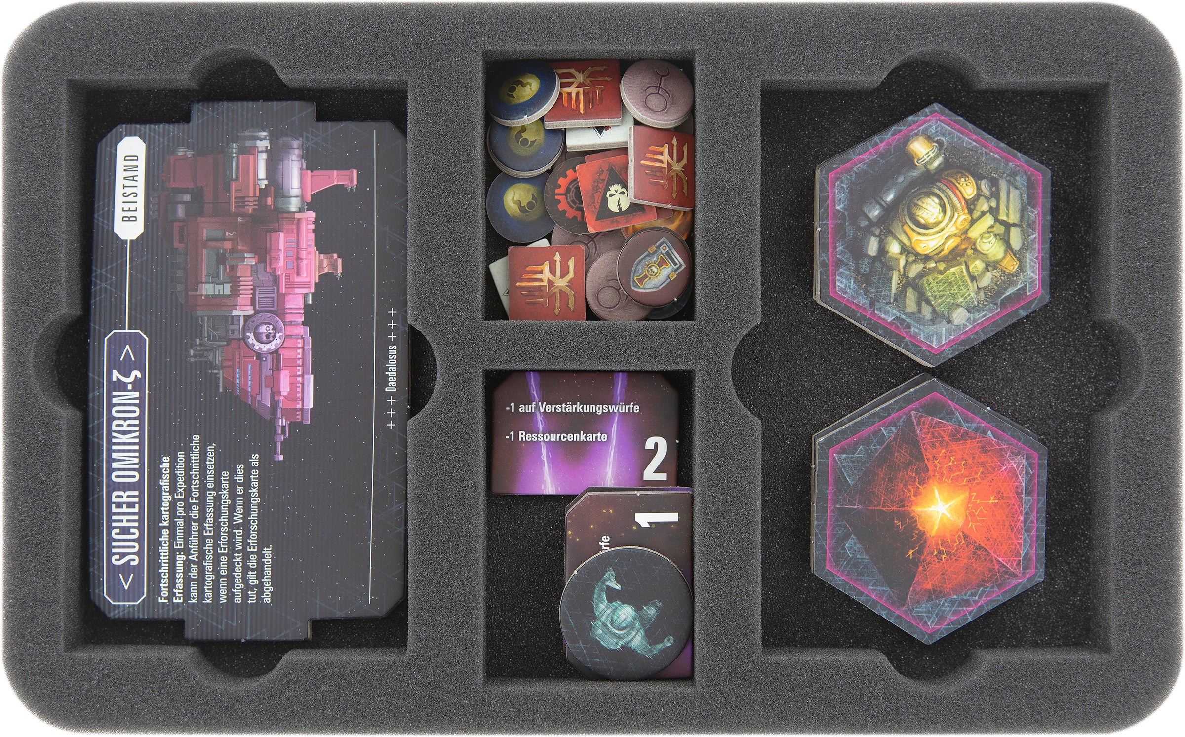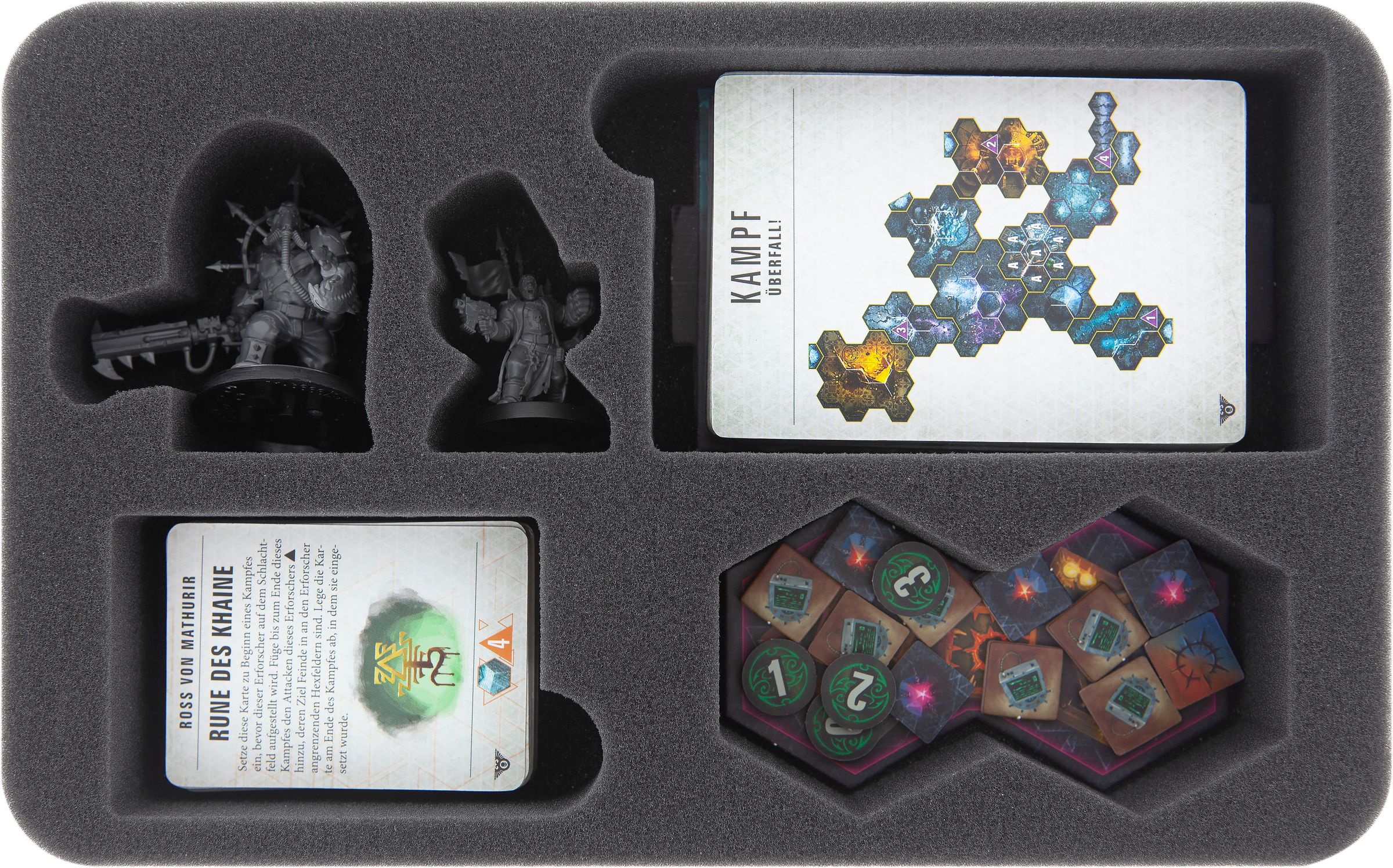 Pour un rangement adéquat du matériel de jeu issu de cette extension, un deuxième plateau en mousse est inclus dans le sac. Ici, vous pouvez trier les terrains de jeu et les segments de terrain, ainsi que les marqueurs. Les grands composants du jeu - les grandes cartes (par exemple les cartes d'initiative), les grandes tuiles et les pièces en carton, l'enveloppe du trône de Mallex et les chambres de stase - sont placés sur le tapis.