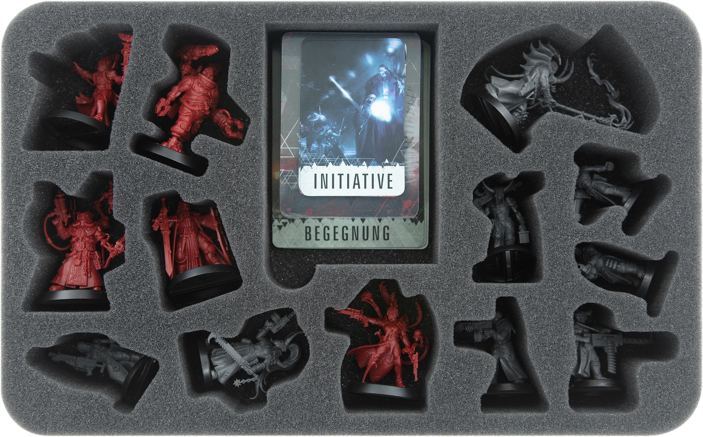 Insérez le numéro trois maisons Daedalosus, Aradia Madellan et les autres miniatures de l'expansion "Escalation". Chacun des 13 modèles dispose de son propre compartiment sur mesure. Le grand compartiment central permet de ranger les cartes de taille moyenne (par ex. les cartes de rencontre) ainsi que les petites cartes (par ex. les cartes d'initiative). Vous pouvez également y ranger d'autres accessoires de jeu, tels que des marqueurs et des dés.