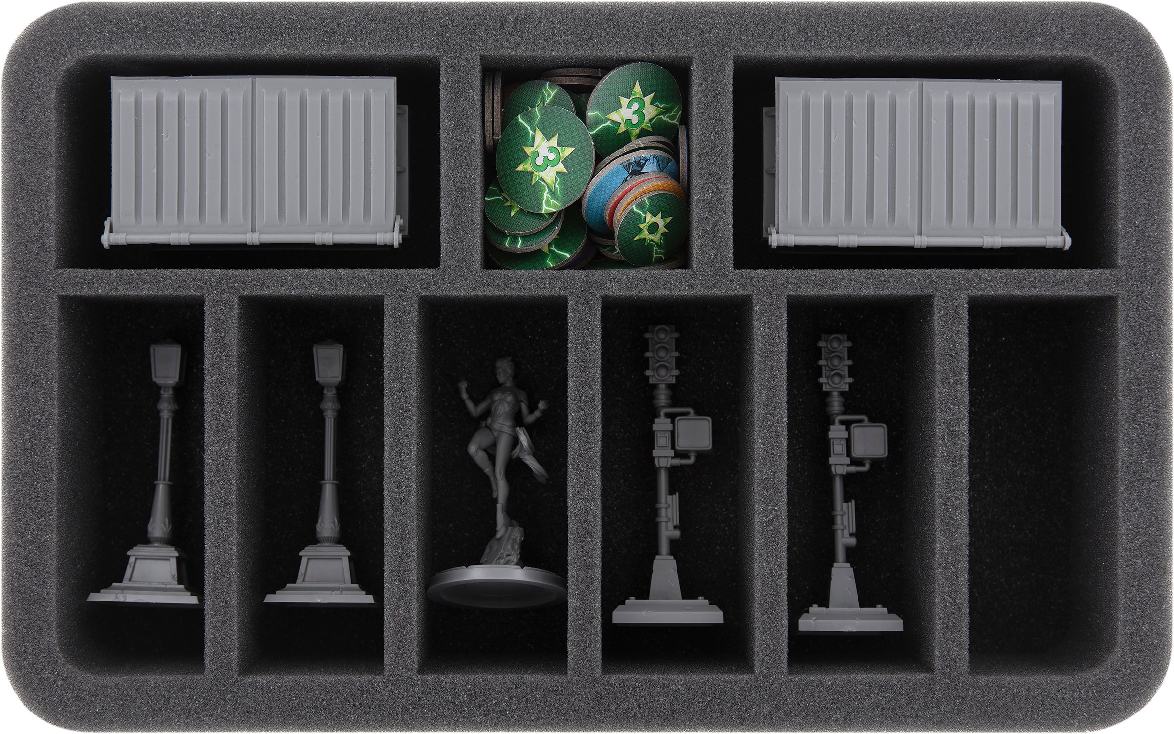 • Cet ensemble offre de l'espace pour les figurines de 10 personnages, les pièces de terrain et les accessoires complets de la boîte de base (CP01) d'Atomic Mass Games.