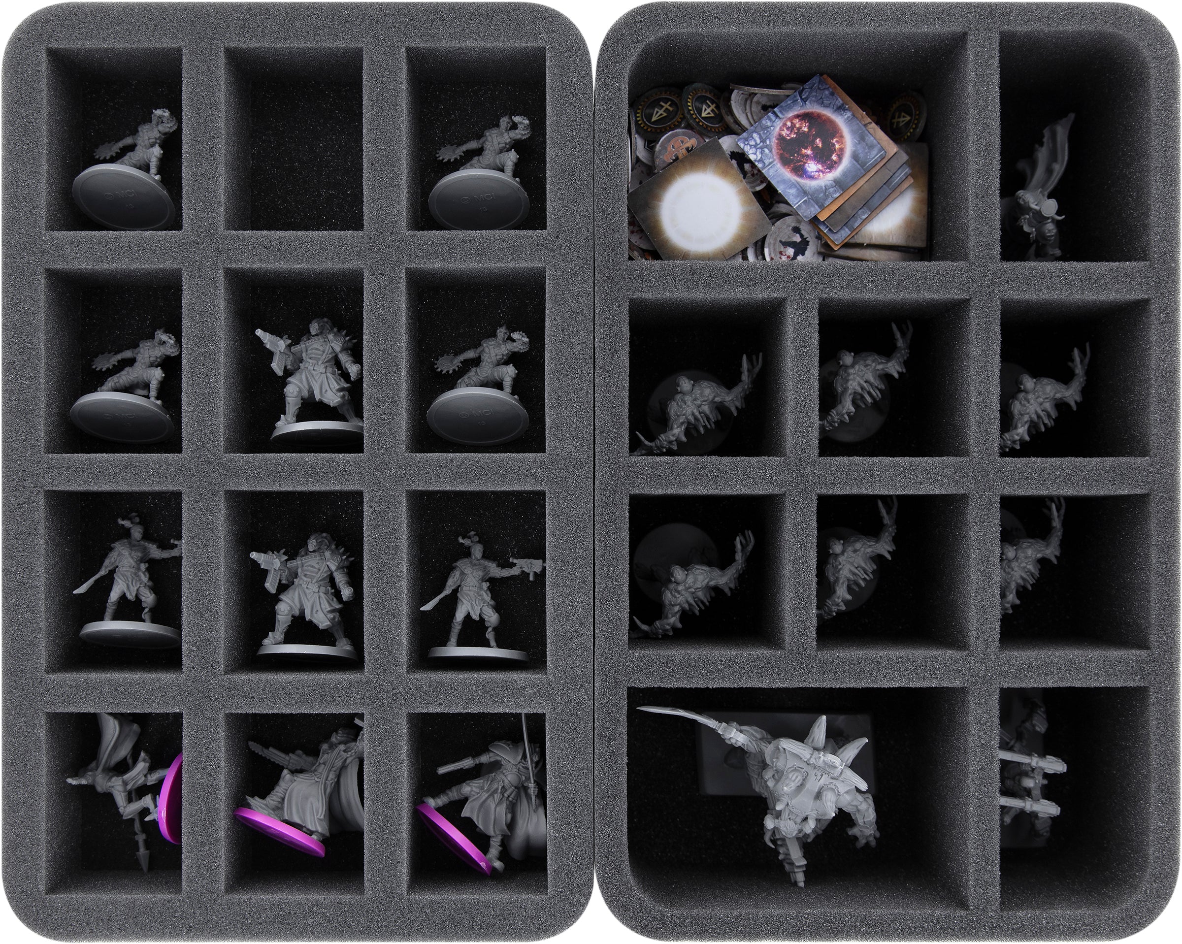 Nous avons inclus un total de trois plateaux Half-Size pour protéger les figurines et le matériel de jeu. Qu'il s'agisse d'un guerrier de la Confrérie, de Valpurgius ou du terrifiant Béhémoth prétorien, chaque figurine trouvera un compartiment correspondant. Grâce à la découpe sur mesure, les figurines sont bien ajustées, et même lorsqu'elles sont transportées dans les profondeurs de l'espace, rien ne glisse et les figurines restent en place.