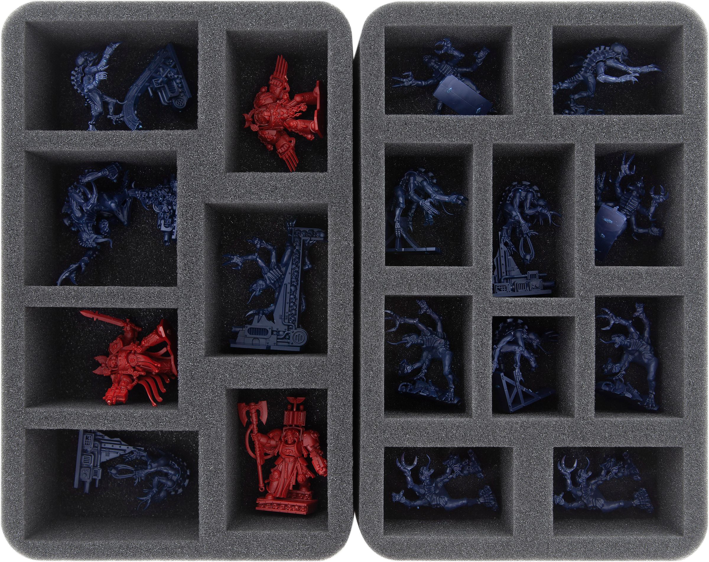 Vous placez les modèles restants sur les deux inserts Half-Size. Ici, les guerriers avec des poses en surplomb, des sceptres ou des armes plus grosses ont un peu plus de place. Ainsi, le maître de reproduction et le bibliothécaire disposent également d'un abri convenable. Les miniatures détaillées sont en sécurité ici. Les griffes restent pointues et les armes prêtes à l'action.