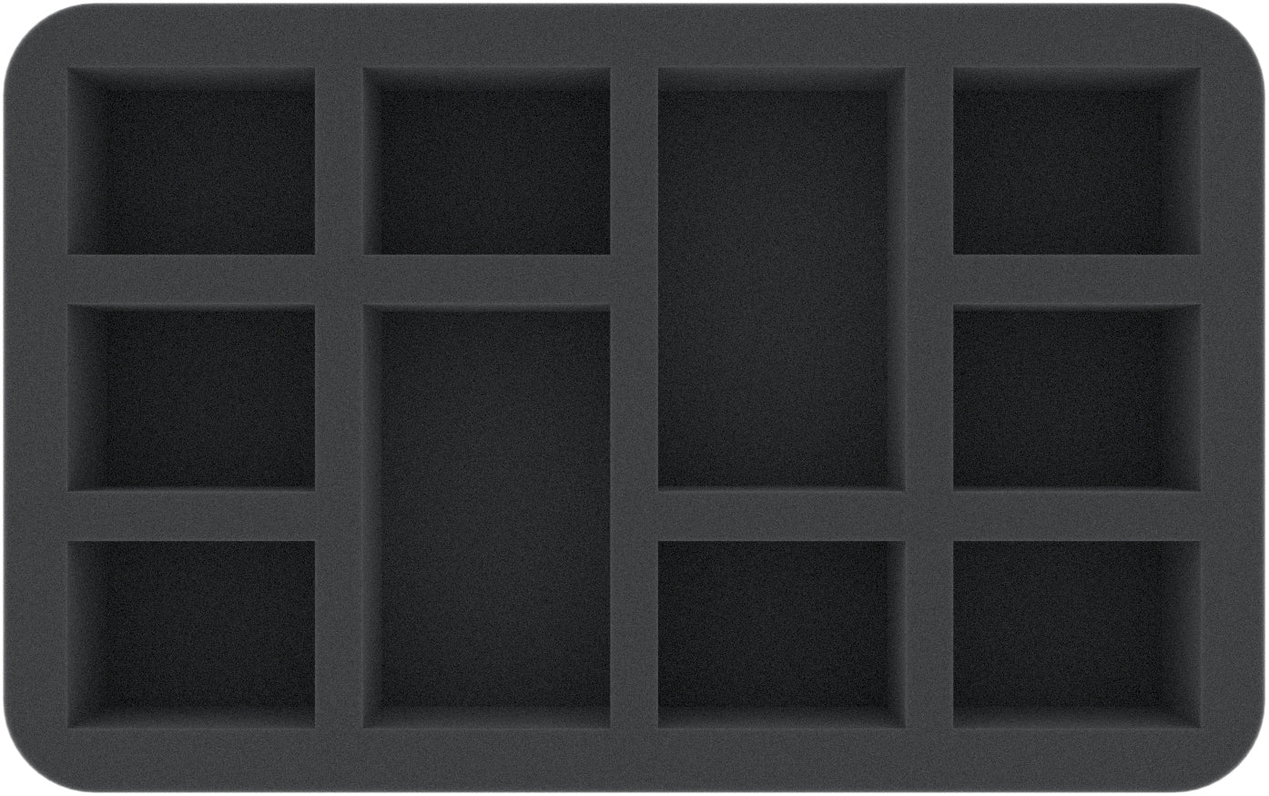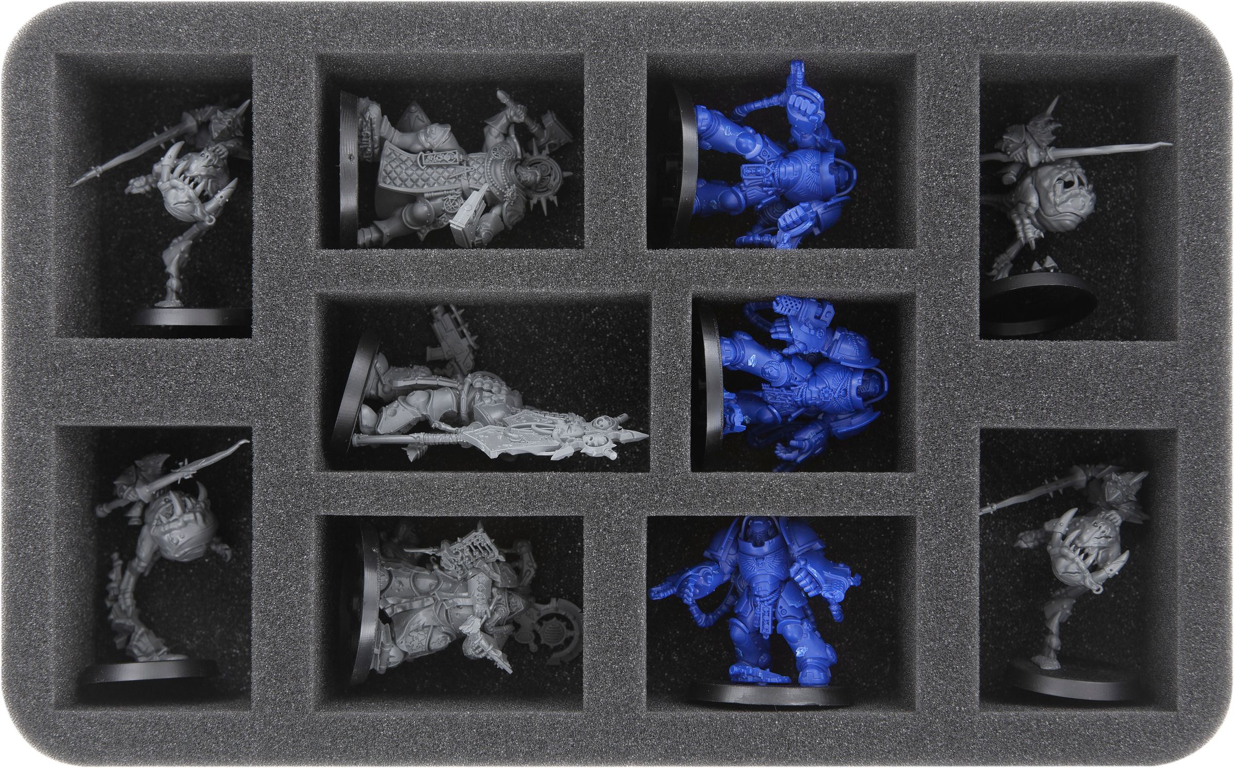 • 1 plateau en mousse Half-Size avec 10 compartiments pour par exemple les Space Marines Primaris (HSLM050BO)