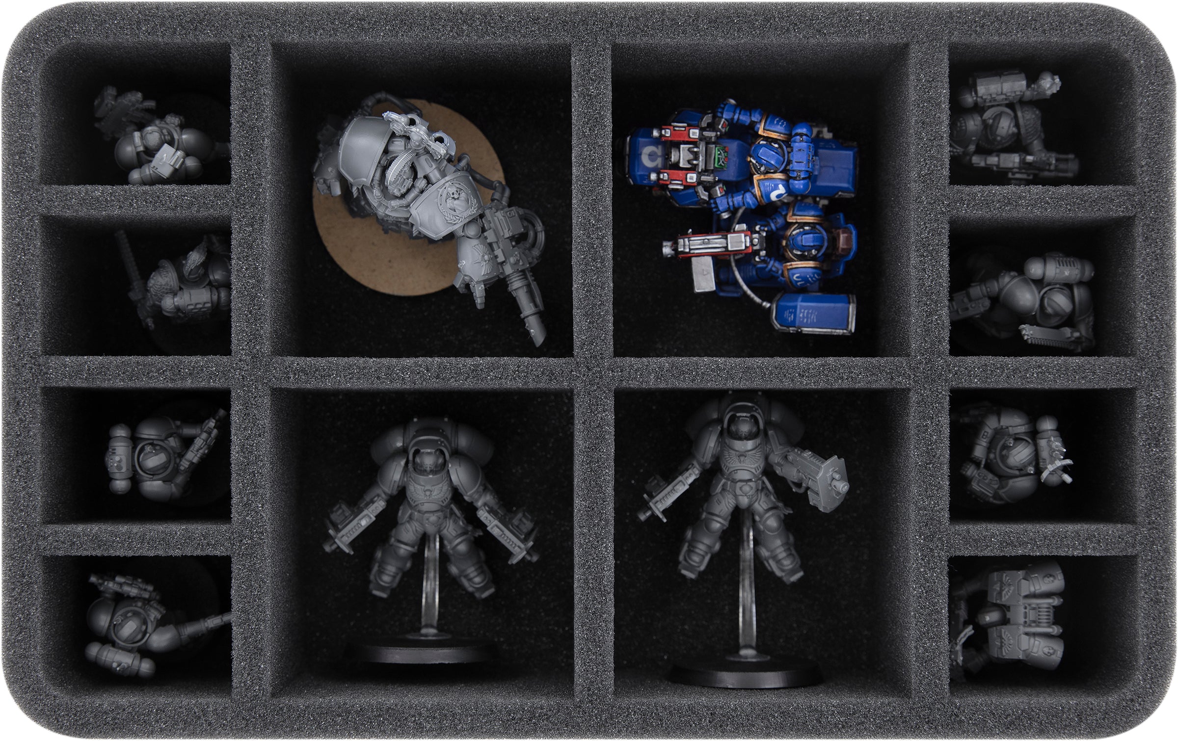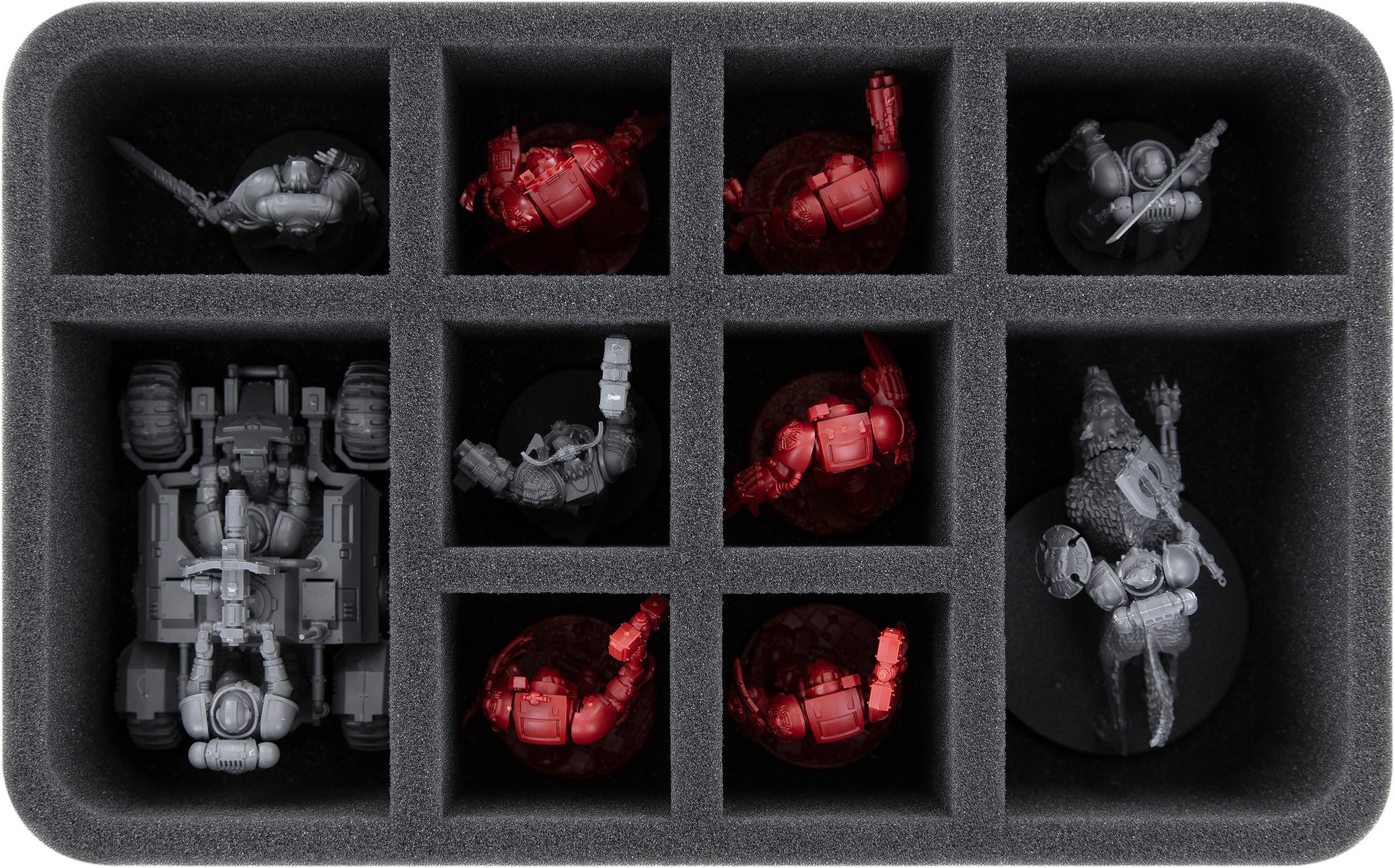 • 1 plateau en mousse Half-Size avec 10 compartiments pour, par exemple, le VTT Invader Primaris supplémentaire, les Terminators, les Space Marines Primaris ou des modèles de taille similaire (HSMFAH070BO).