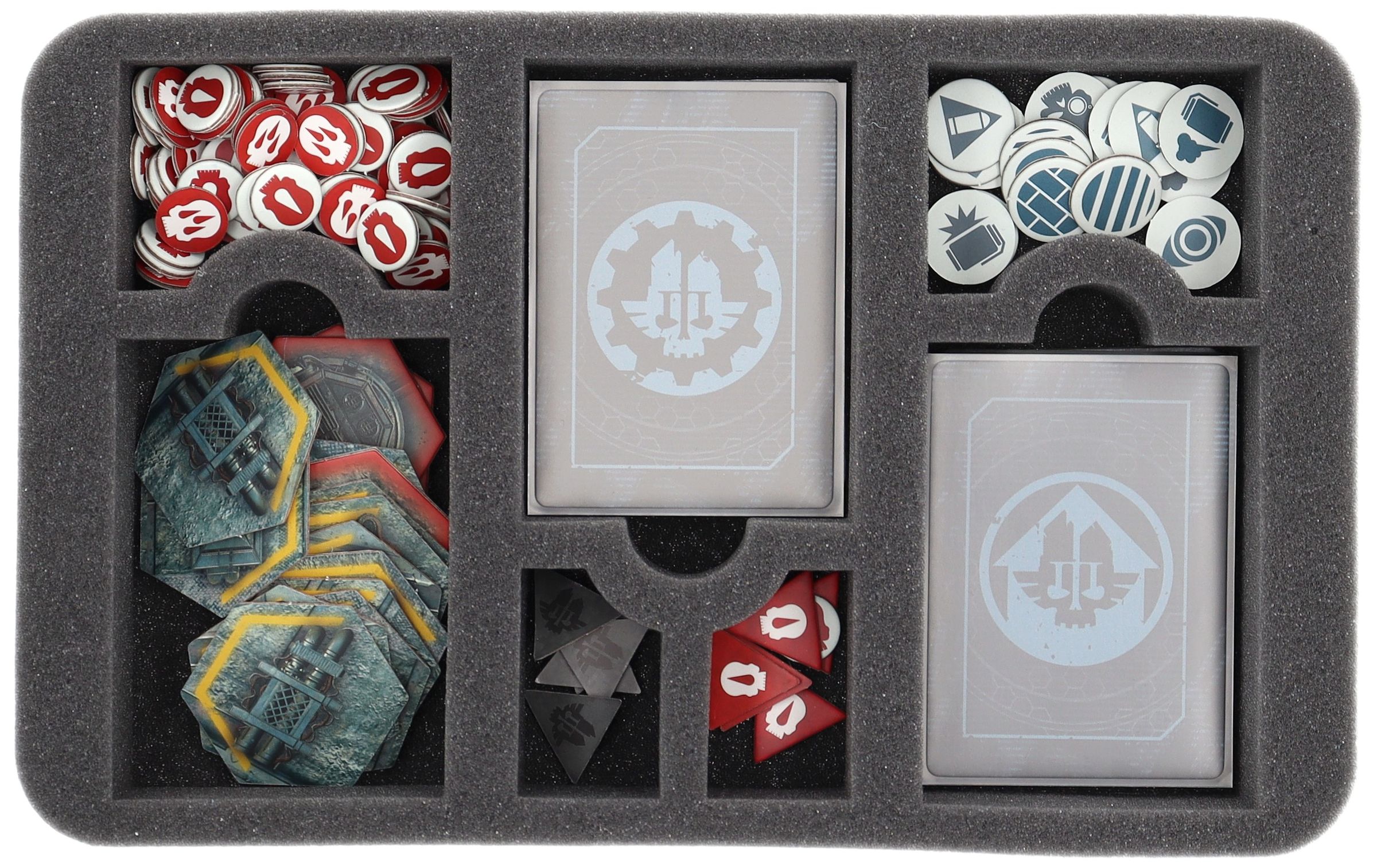 • 1 plateau demi-taille en mousse avec 7 compartiments pour le matériel de jeu comme les cartes au format 63 mm x 88 mm (Standard Card Game Size), les jetons et les dés (HSMEQO050BO)