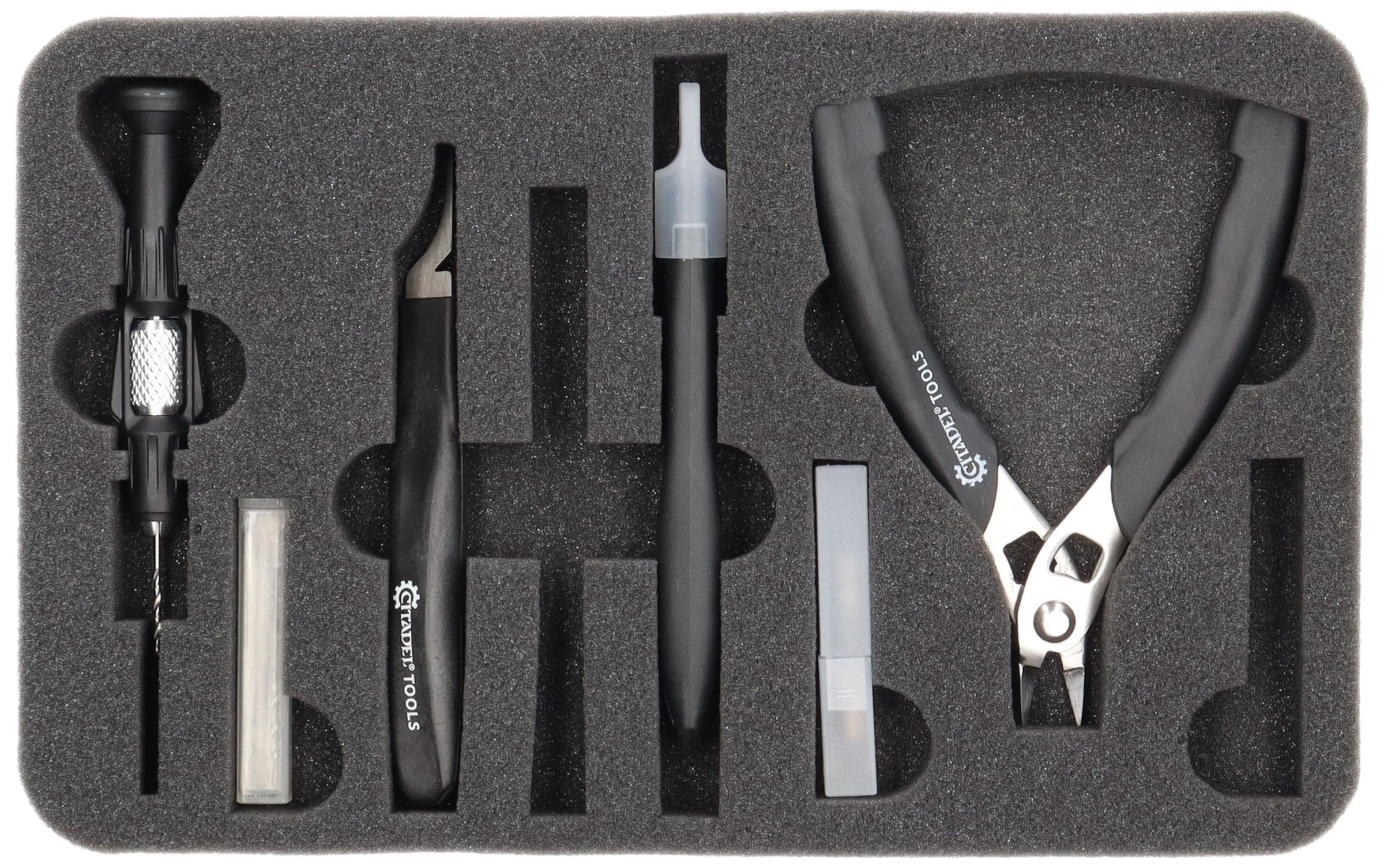 Tous les outils essentiels dont vous avez besoin pour assembler et modifier vos figurines peuvent être placés ici. Les compartiments sont adaptés aux outils de loisirs les plus fréquemment utilisés par les différents fabricants, tels que Army Painter, Italeri ou Vallejo.