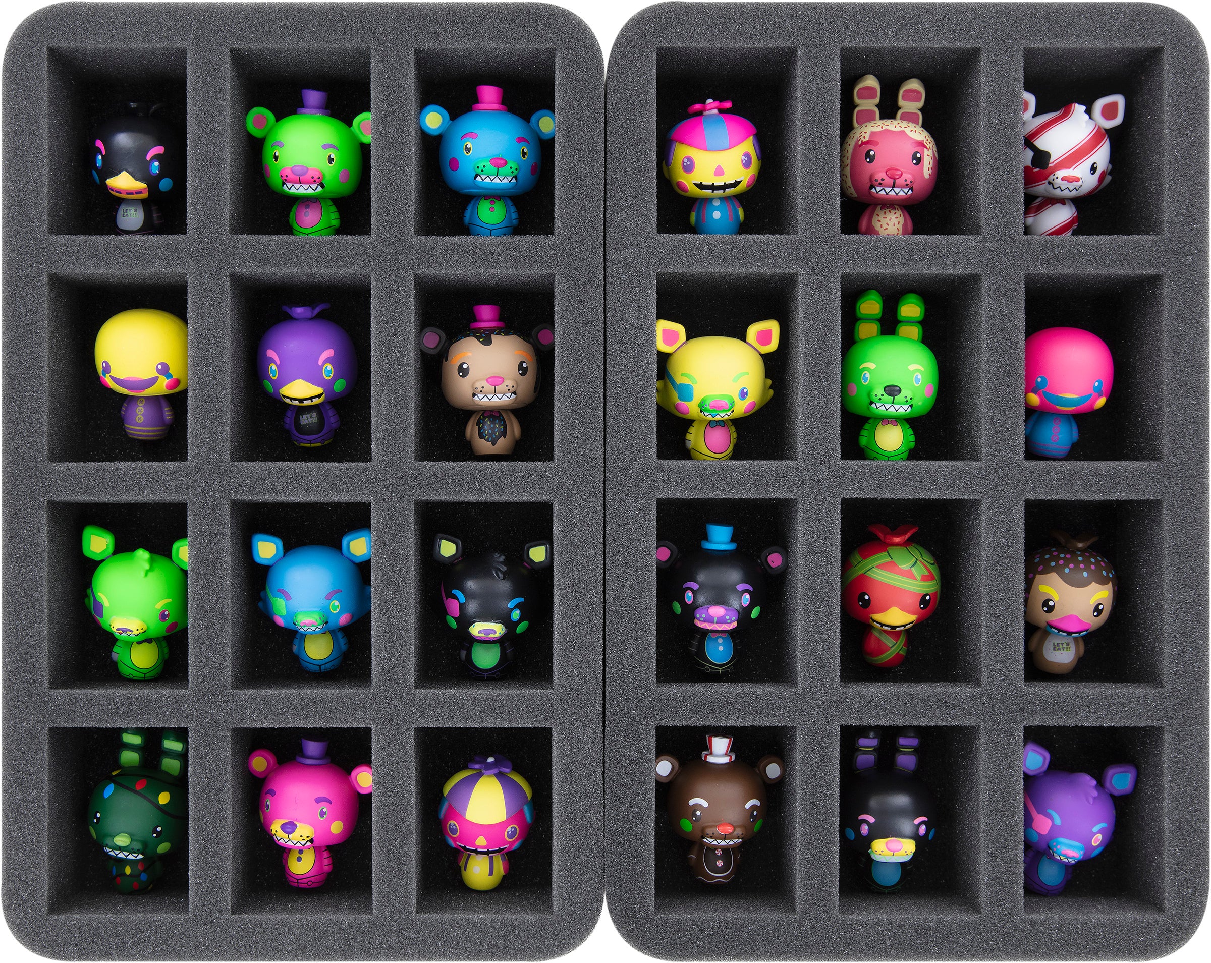 - 2 Half-Size mousses de rangement avec douze compartiments chacun pour les Pocket Pops Funko de taille standard ou les figurines aux dimensions similaires (HS050I012BO)