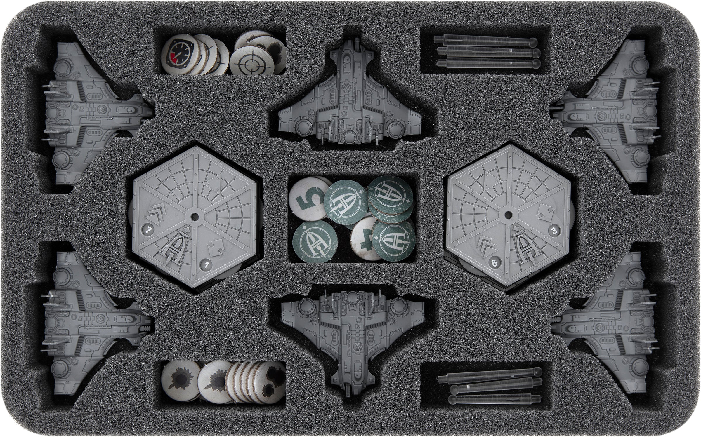 Les plus grands Tiger Shark Bombers commencent leurs assauts à partir de l'insert à huit compartiments. Que vous les équipiez de lourds canons à fagots ou de lourds accélérateurs à plasma, les Tiger Shark Bombers trouveront leur place dans les deux variantes dans le plateau. Vous pouvez utiliser les autres compartiments pour les petites pièces, les jetons ou les dés.