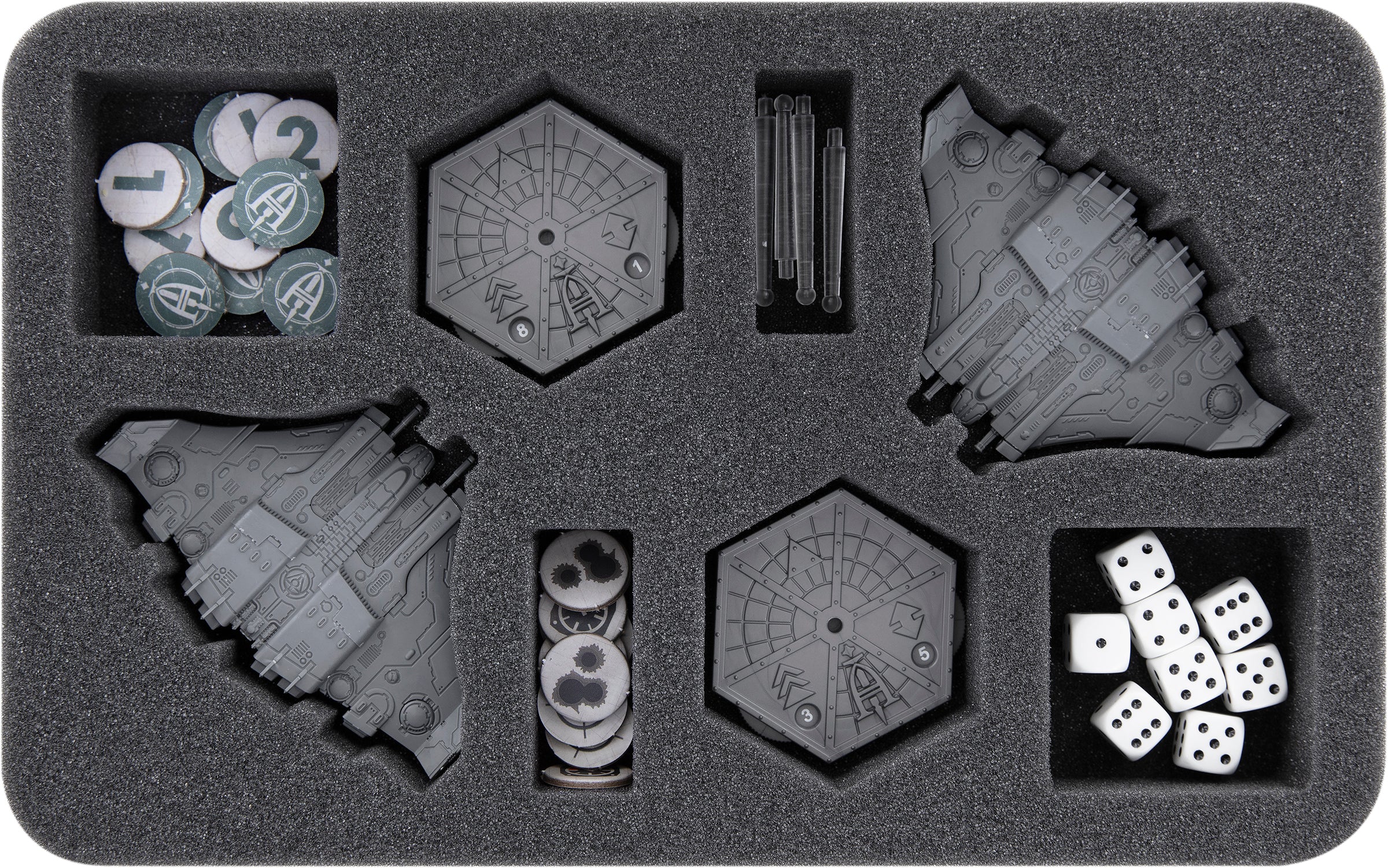 Les agiles chasseurs Barracuda atterrissent dans le plateau Half-Size à onze compartiments. Six compartiments sont faits sur mesure pour toutes les versions des modèles d'aviateurs. Placez les jetons, les dés, les bases et les petites pièces (par exemple les bombes, les fusées) dans les compartiments restants.