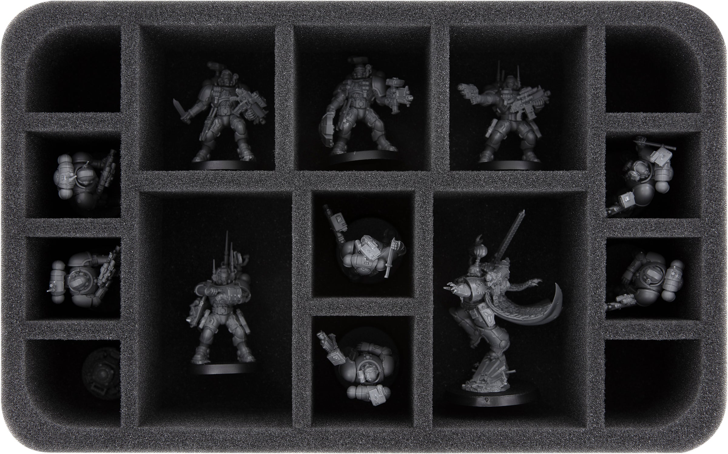 L'insert offre une cachette sûre pour les 11 figurines de la troupe autour de Ragnar Blackmane. Des compartiments parfaitement adaptés à chaque modèle garantissent que les figurines ne glissent pas ou ne se heurtent pas les unes aux autres pendant le transport. Cela permet également de protéger les couleurs des Marines peintes contre l'abrasion et les rayures.