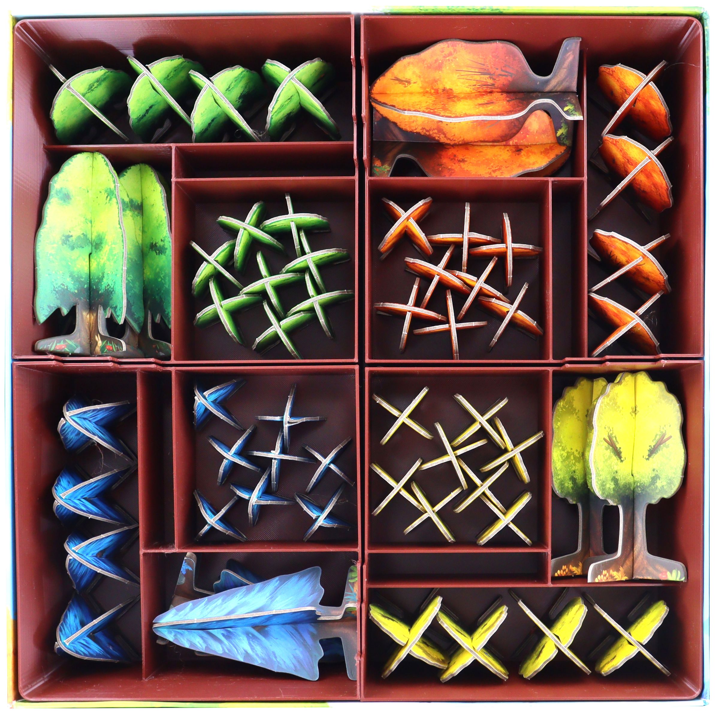 - Permet de garder la boîte et le plateau de table bien rangés. Chaque joueur reçoit sa pépinière avec les arbres de sa couleur de jeu.