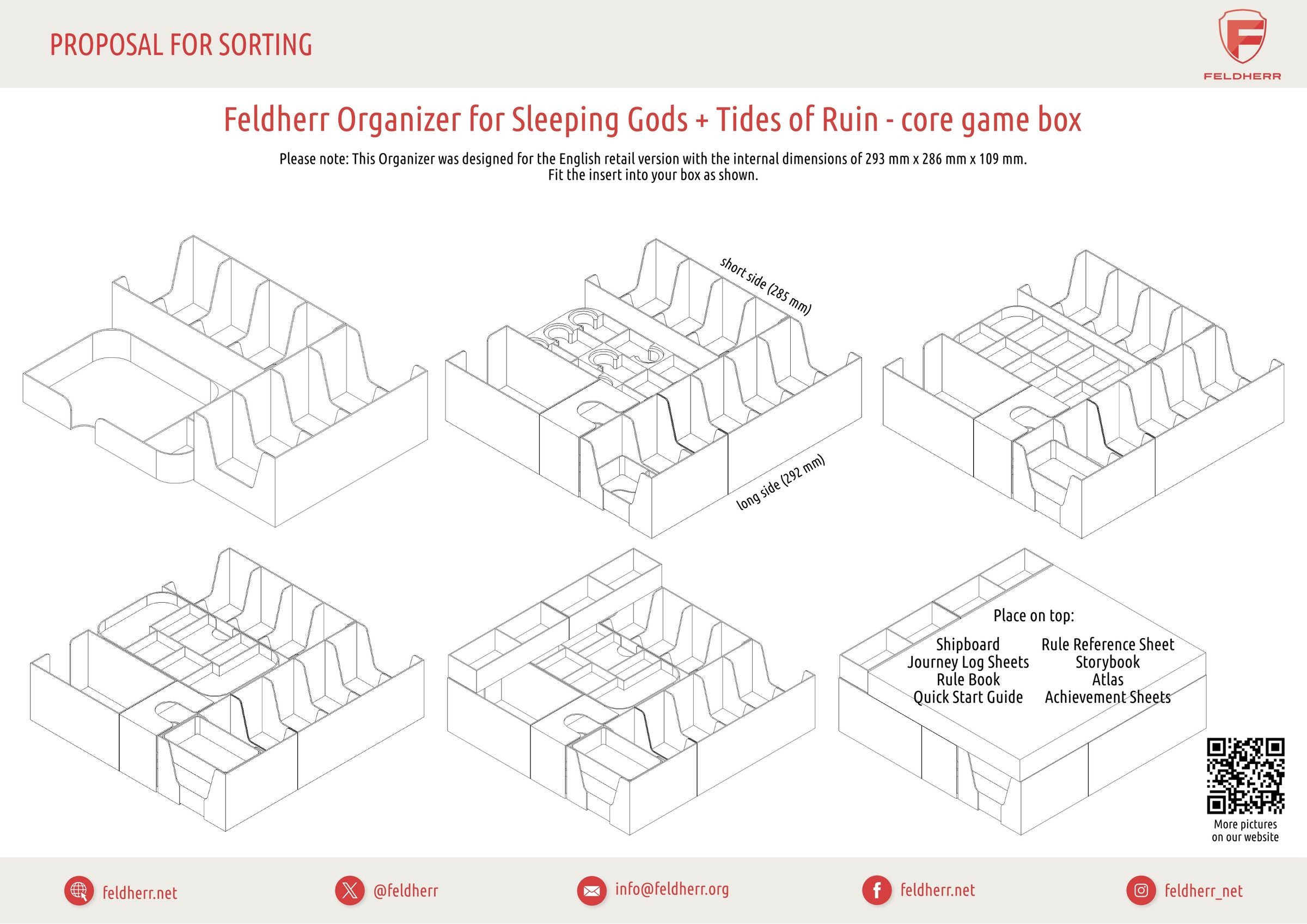 - Le Organizer en plastique s'insère parfaitement dans la boîte originale du jeu de base "Sleeping Gods". Remarque : notre solution a été conçue pour la version anglaise du jeu, dont les dimensions internes sont de 293 mm x 286 mm x 109 mm. (Dimensions du Organizer : environ 292 mm x 285 mm x 102 mm).