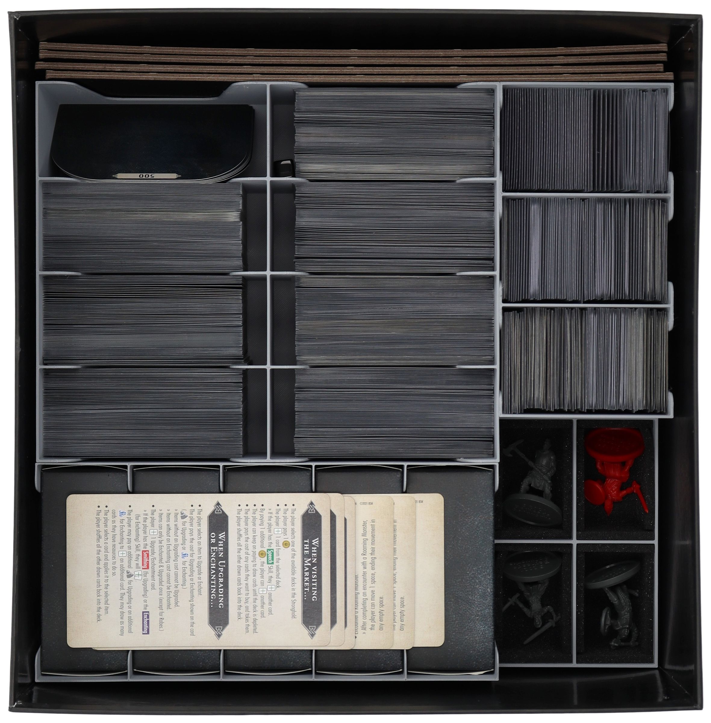 - Les 6 figurines du jeu de base, ainsi que la figurine promotionnelle du set Kickstarter, sont placées dans des compartiments individuels rembourrés de mousse.