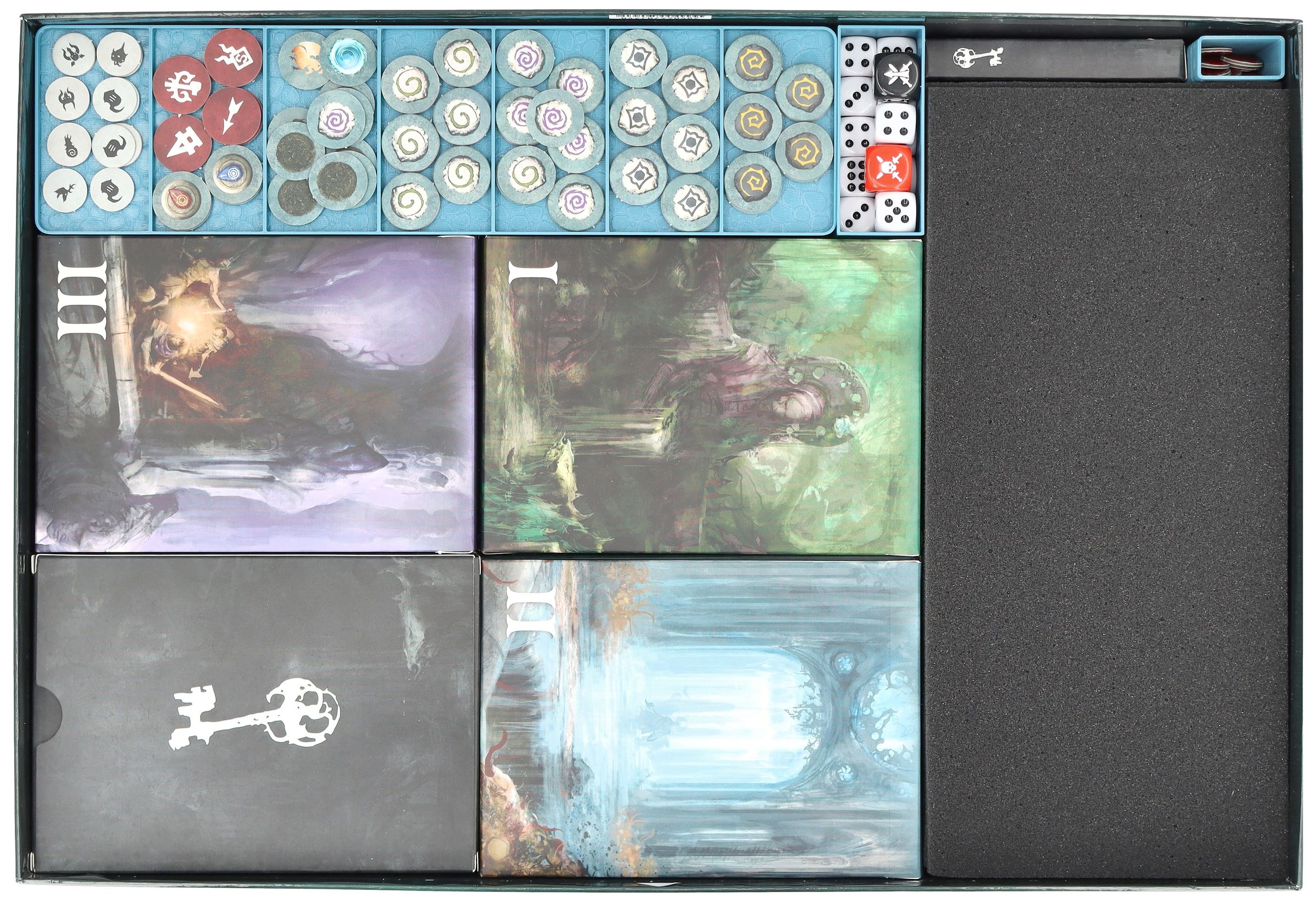 • Le livre de quête repose sur les plateaux de jetons et sécurise le contenu - pour un rangement soigné et sans glissement.